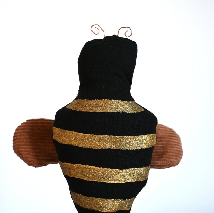 A bee which has been sewn and hand painted with gold stripes, it has brown corduroy wings and copper wire antenna.