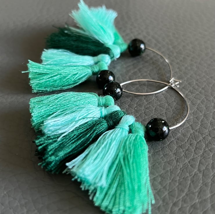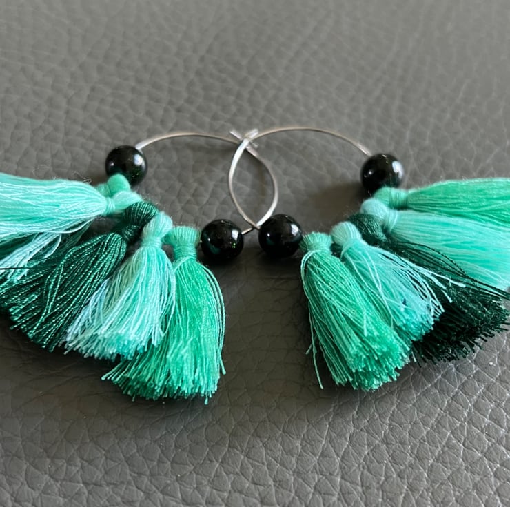 These handmade earrings feature soft green tassels paired with glossy Emerald Nile beads, creating a stylish and eye-catching boho look. Lightweight and comfortable to wear, they add a pop of colour and movement to any outfit.