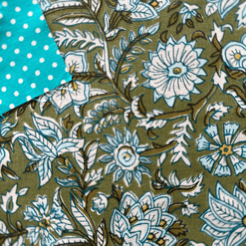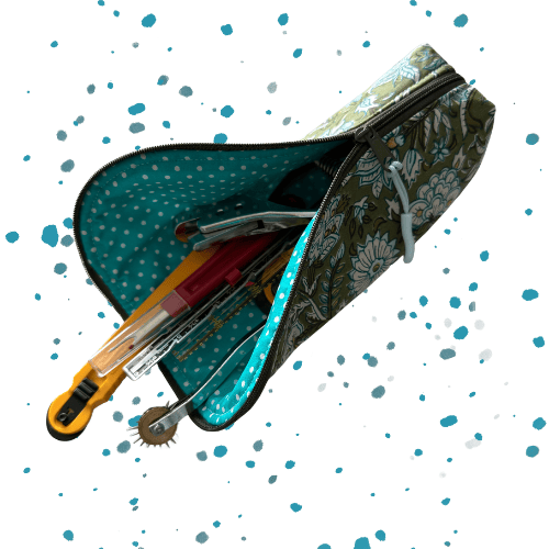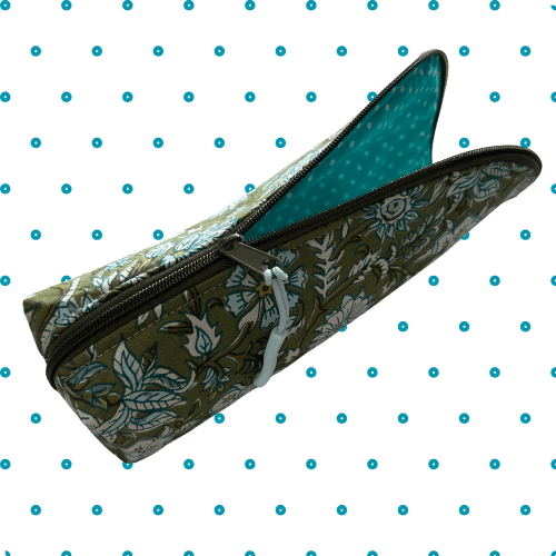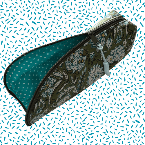 Sewn by hand using a Jacobean style floral and foliage cotton with a dark green background and lined with co-ordinating bright turquoise spot fabric, it is stylish and bold. The zip opens wide, and then folds down so that everything inside is within reach, then closes snugly when it is time to tidy up. It is softly structured so that it keeps its shape without feeling stiff.