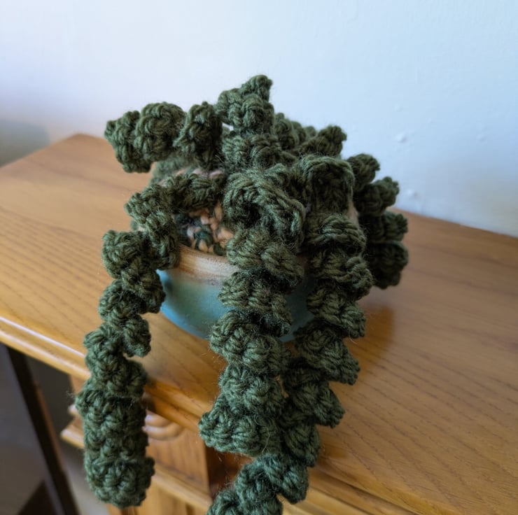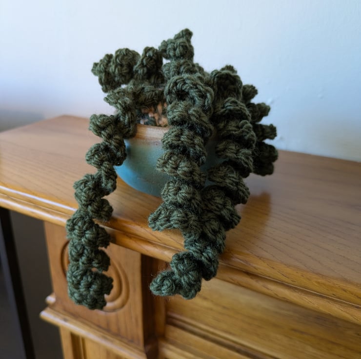 This handmade crochet curly plant is designed to mimic the soft, cascading look of a real succulent, bringing cosy, calming vibes to any room. Nestled in a quality ceramic plant pot, it's a unique piece that blends handmade craft with quirky, upcycled style.