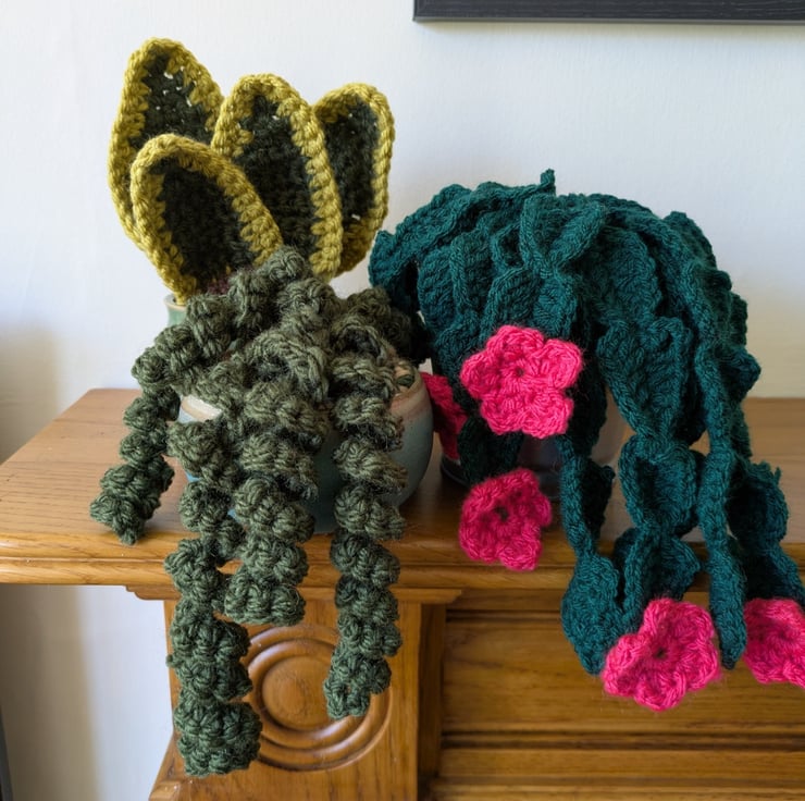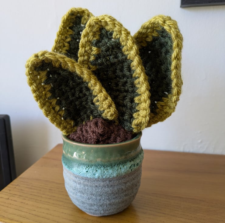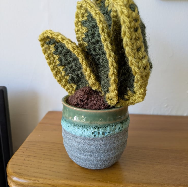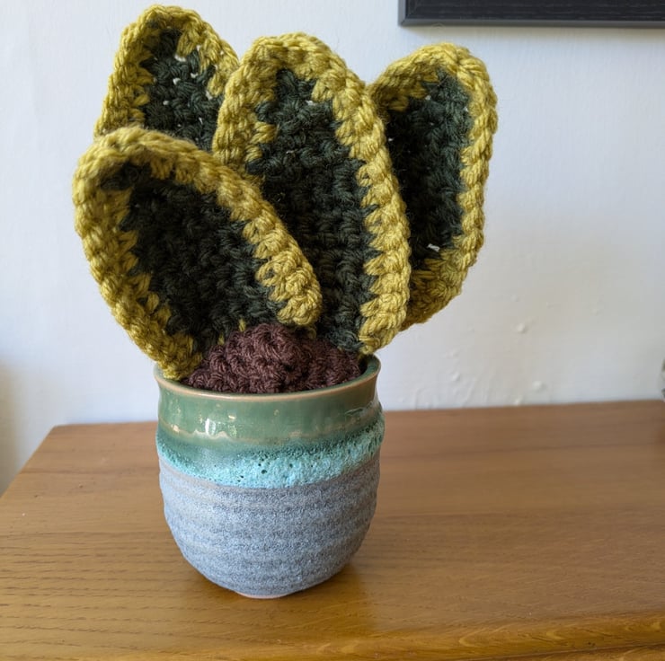 This handmade crochet snake plant is designed to mimic the look of a real succulent, bringing cosy, calming vibes to any room. Nestled in a ceramic plant pot, it's a unique piece that blends handmade craft with quirky, upcycled style.