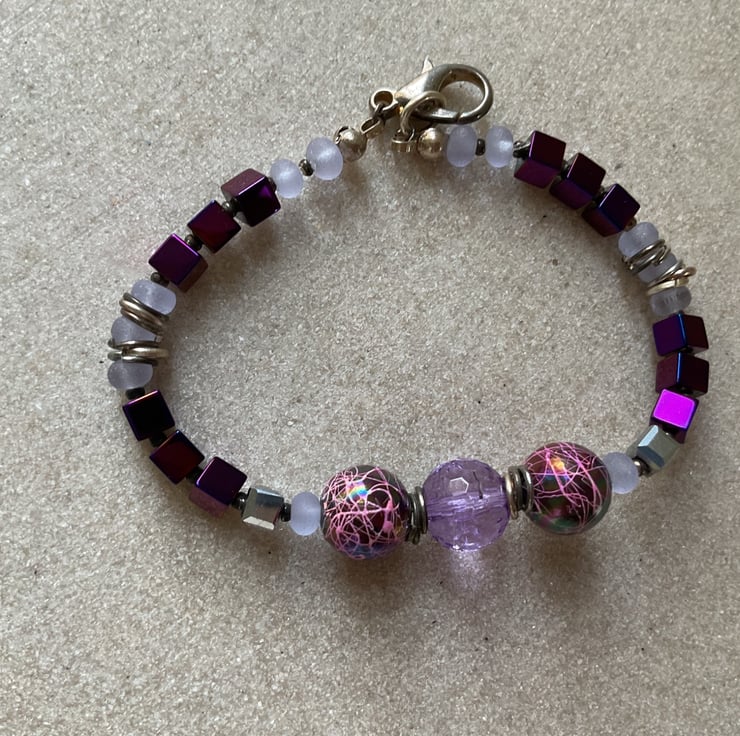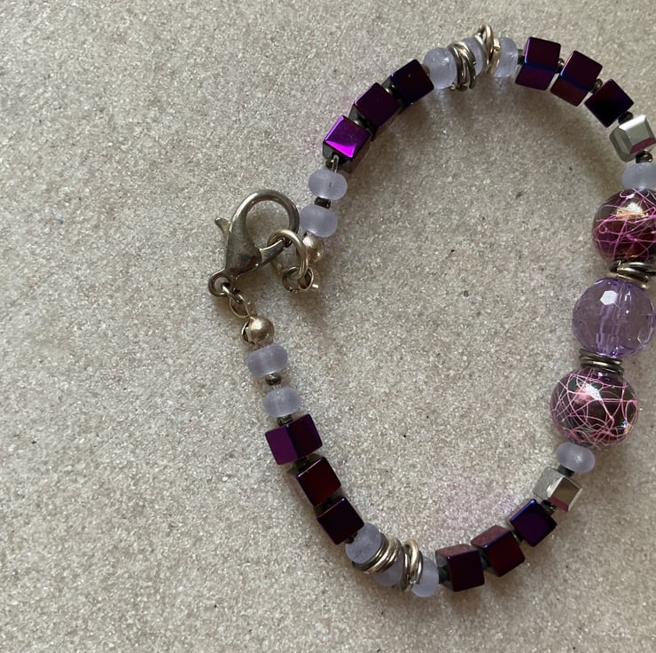 This bracelet has a mixture of lilac tiny sea glass rounds, small glossy cubes in purple and silver all with a centre piece of two purple glass beads with pink scribbles over them between those two is a lilac faceted bead. There are other tiny silvery pieces and the bracelet fastens with a silvertone lobster clasp. The length of the bracelet is 19cms.