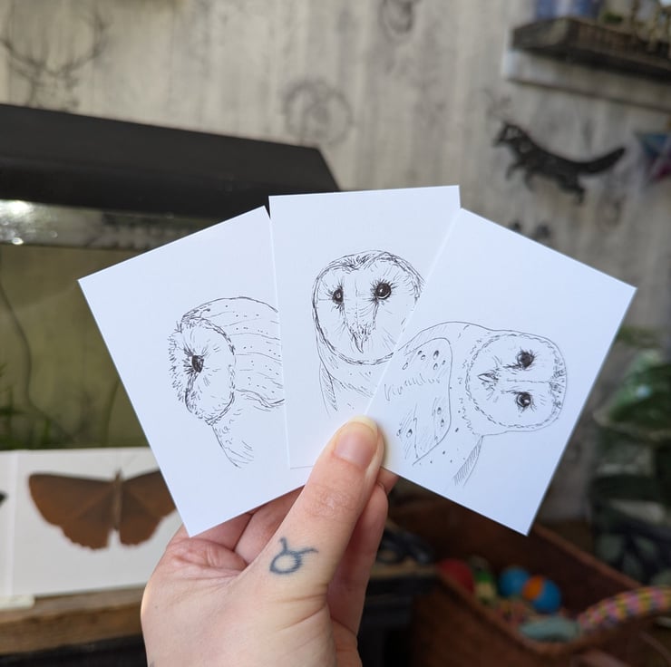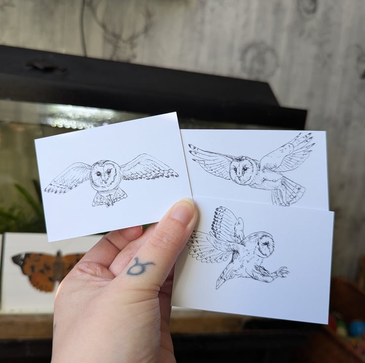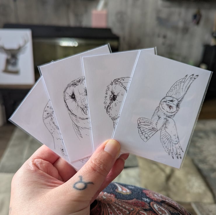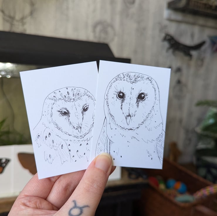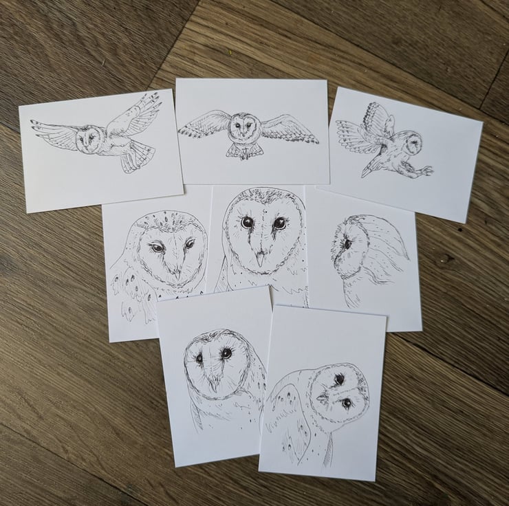 This is a set of 8 hand sketched Barn Owl ACEOs, made by myself. Sketched with pencil and outlined with a black, felt-tip liner.