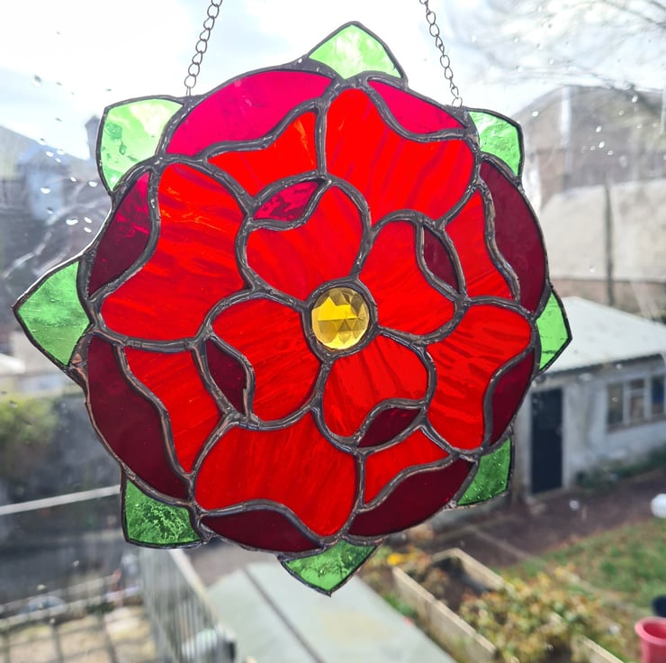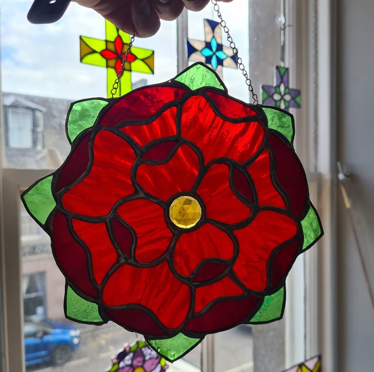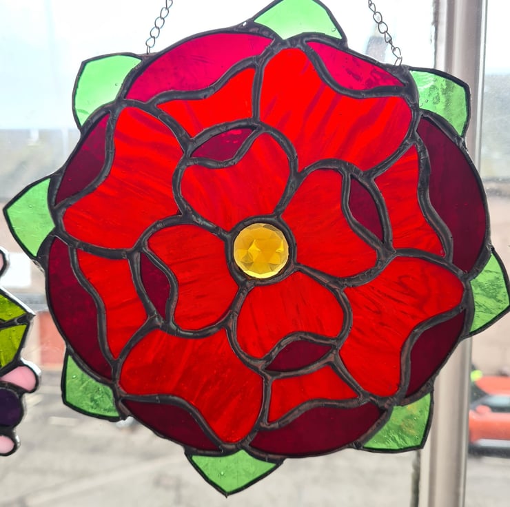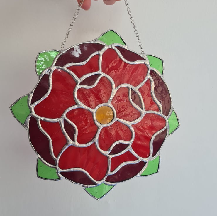 The gentle curves of this floral mandala and the vibrant reds of piece can't help but draw attention! Wuth a cut glass amber gem at its centre this gorgeous stained glass suncatcher is made using the traditional Tiffany method, where each piece of glass is hand cut, shaped and wrapped in a copper foil before being soldered together. Made to last and will enchant you for years to come! Measuring 20x20cm approximately, hanger included.