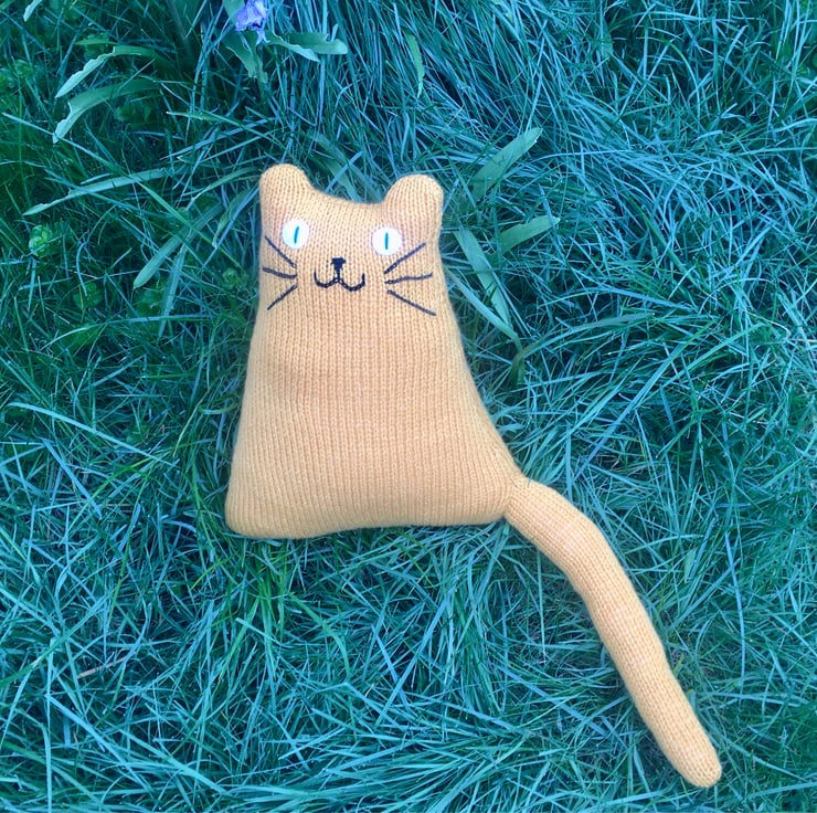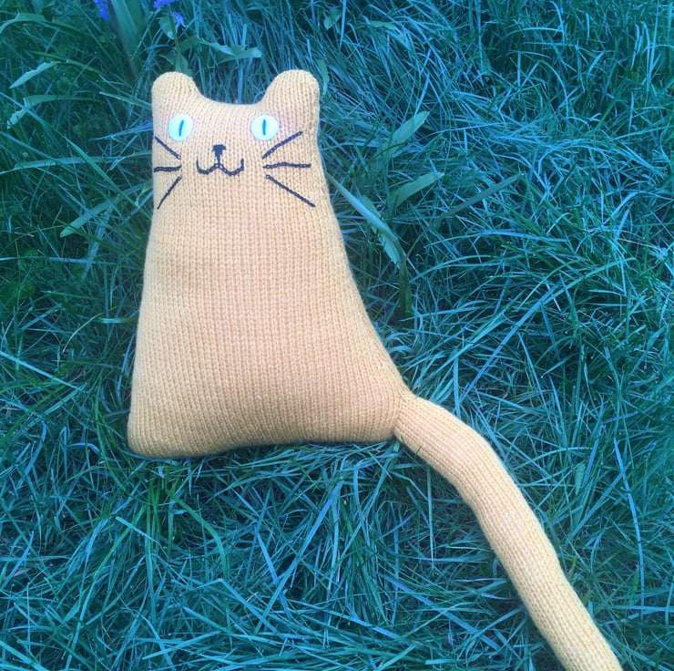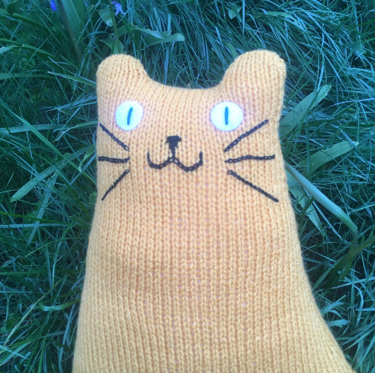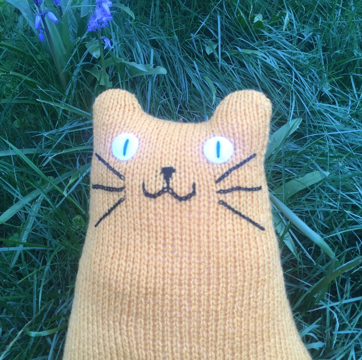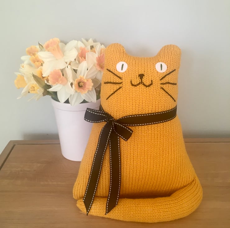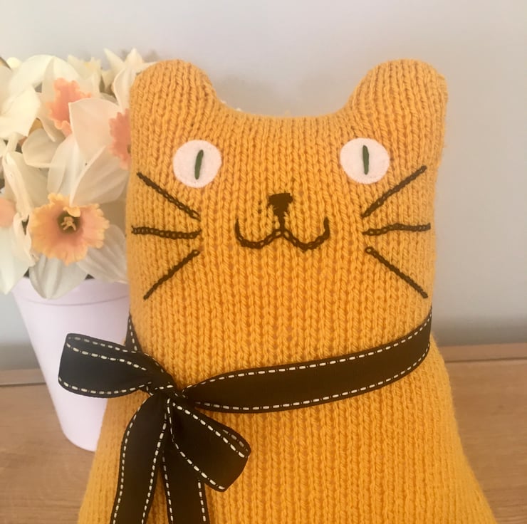 Our yellow cat is hand knitted from soft DK acrylic yarn & is filled with safe soft toy stuffing. The whiskers and face are made from cotton thread and eyes are made from felt.
