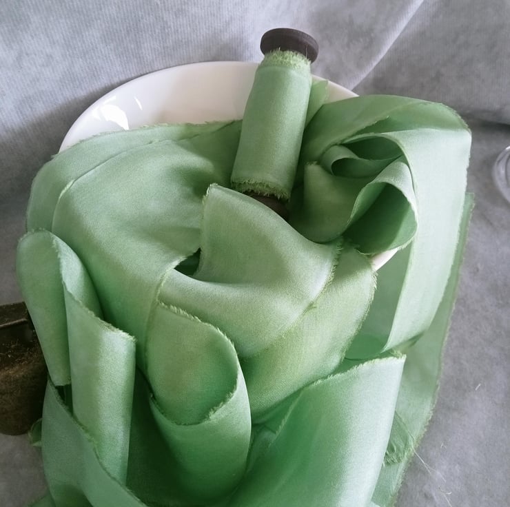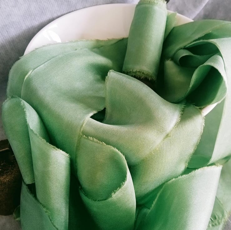 The hand dying process can leave gentle watermarking and marbling of colour adding to the unique nature of each ribbon.