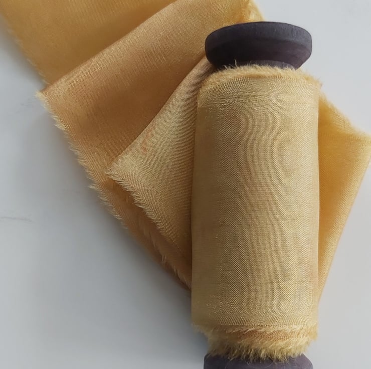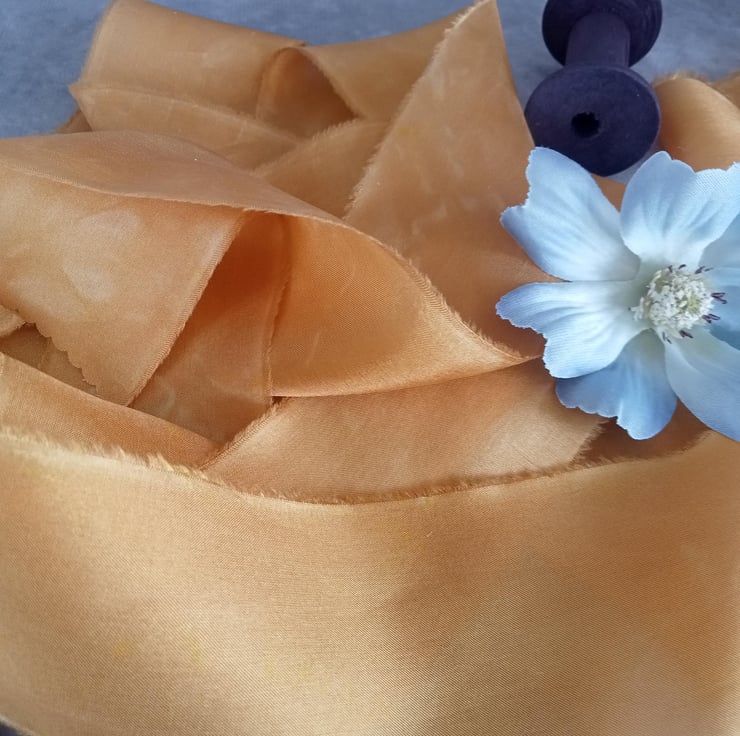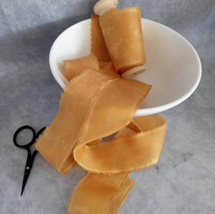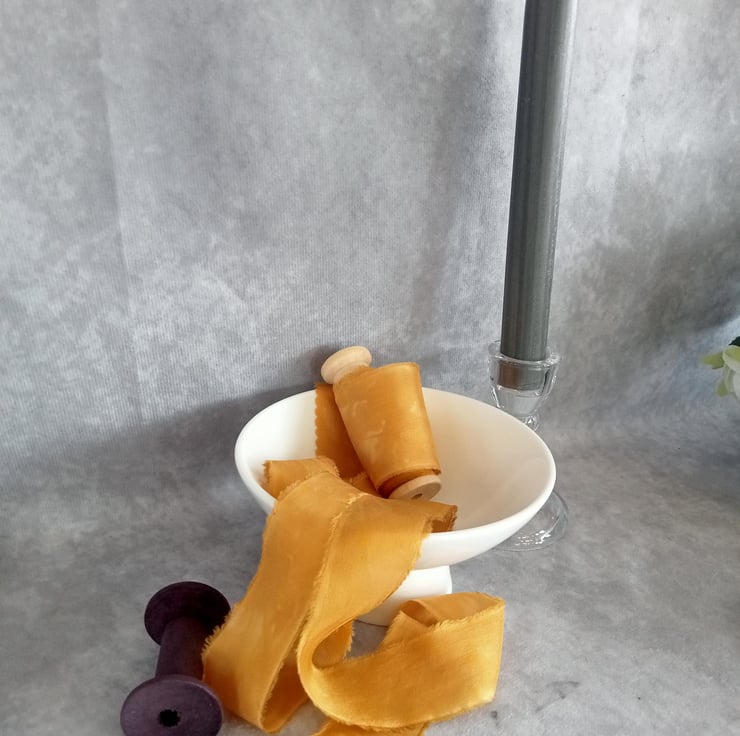 The hand dying process can leave gentle watermarking and marbling of colour adding to the unique nature of each ribbon.