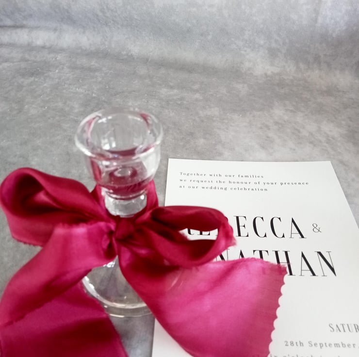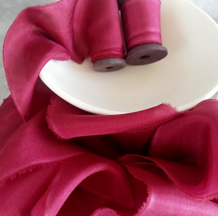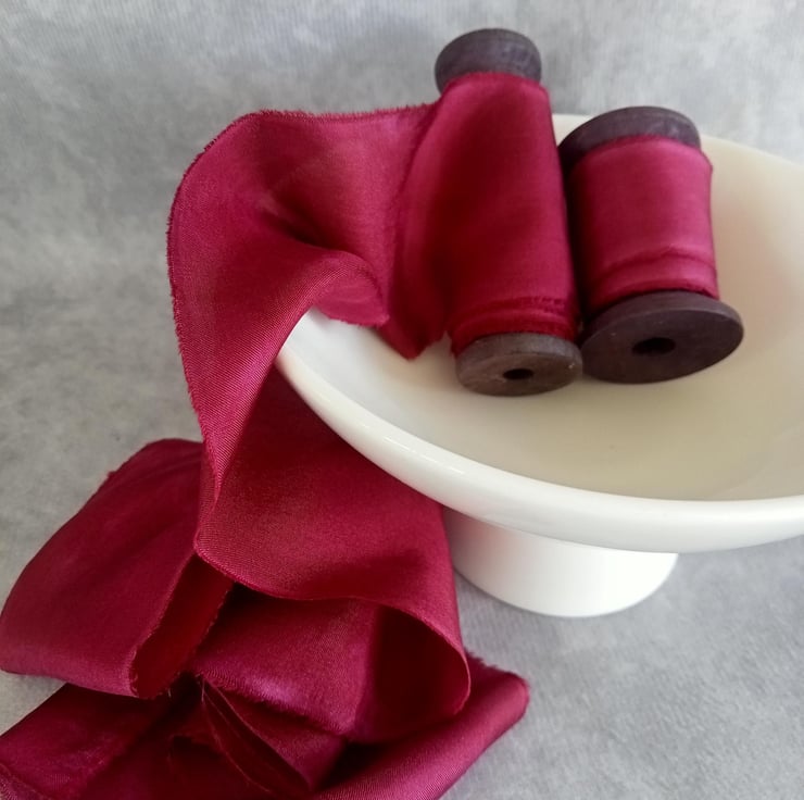 The hand dying process can leave gentle watermarking and marbling of colour adding to the unique nature of each ribbon.