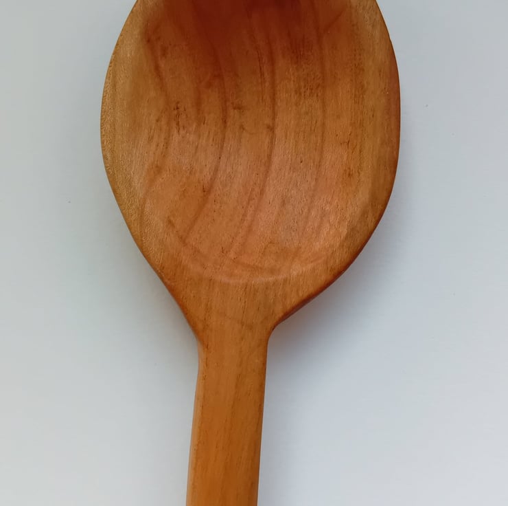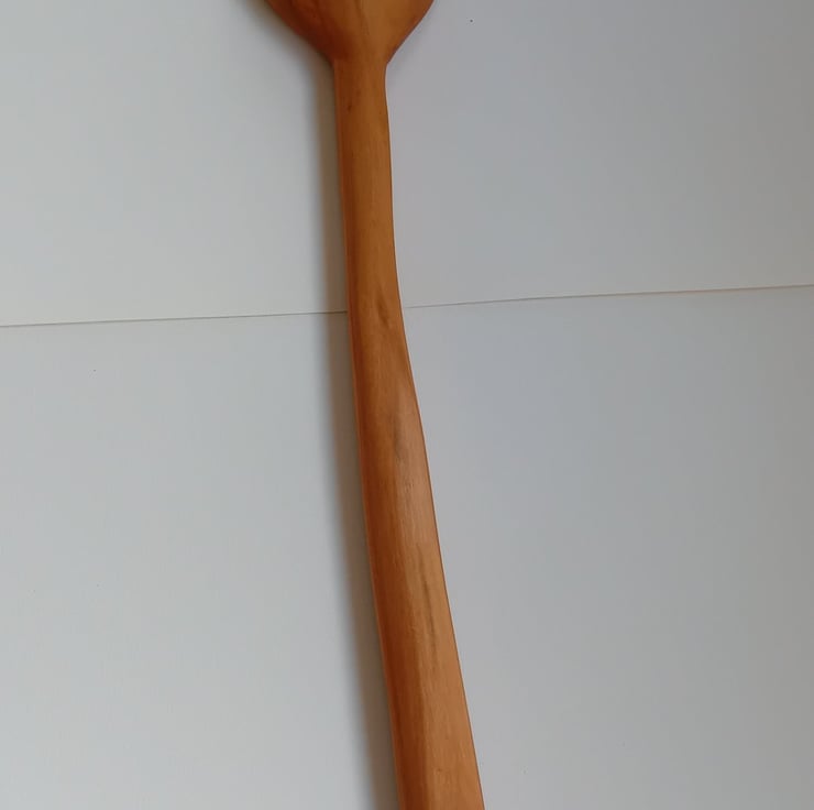 A unique large spoon of Cherry wood hand carved with traditional drawknife and spokeshave. It has been sustainably sourced from coppiced woodland and finished with food safe tung oil. 39cm long approx.