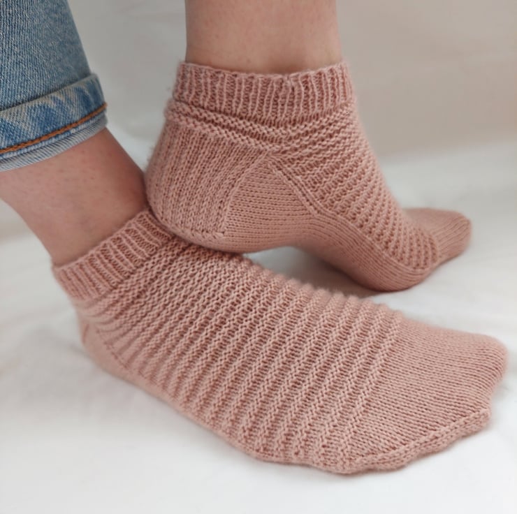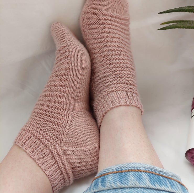 These cosy ankle socks are designed to be simple, wearable, and a joy to knit. Worked from the cuff down, they feature a snug 1x1 ribbed cuff and a beautifully subtle textured pattern across the leg and foot, created using a mix of knit and purl stitches. The result is a soft, lightly rolled texture that looks delicate while staying easy and relaxing to knit.