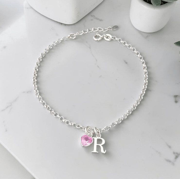 Sterling Silver dainty Initial and heart Birthstone adjustable Bracelet perfect for gifting or one for your jewellery collection. With a choice of 12 stunning Birthstone colours.