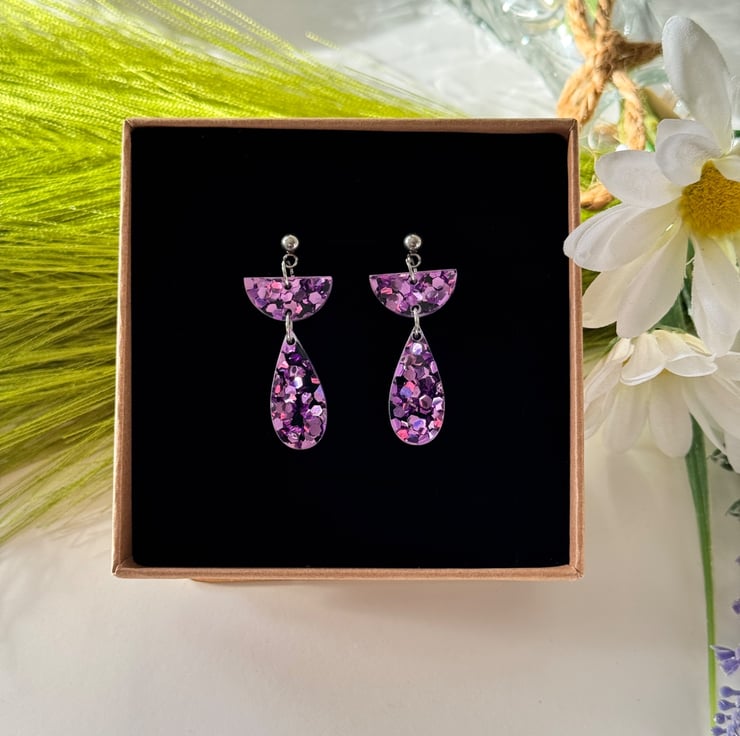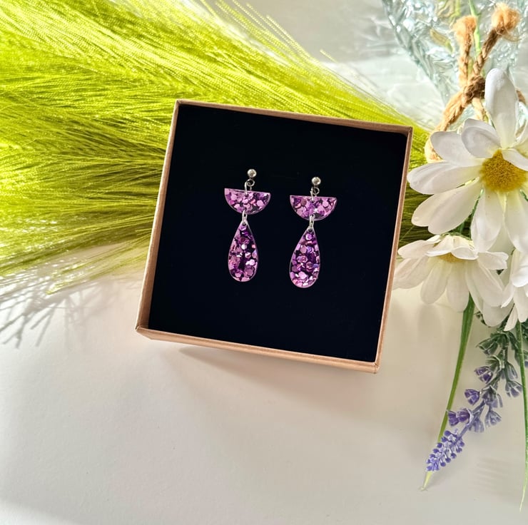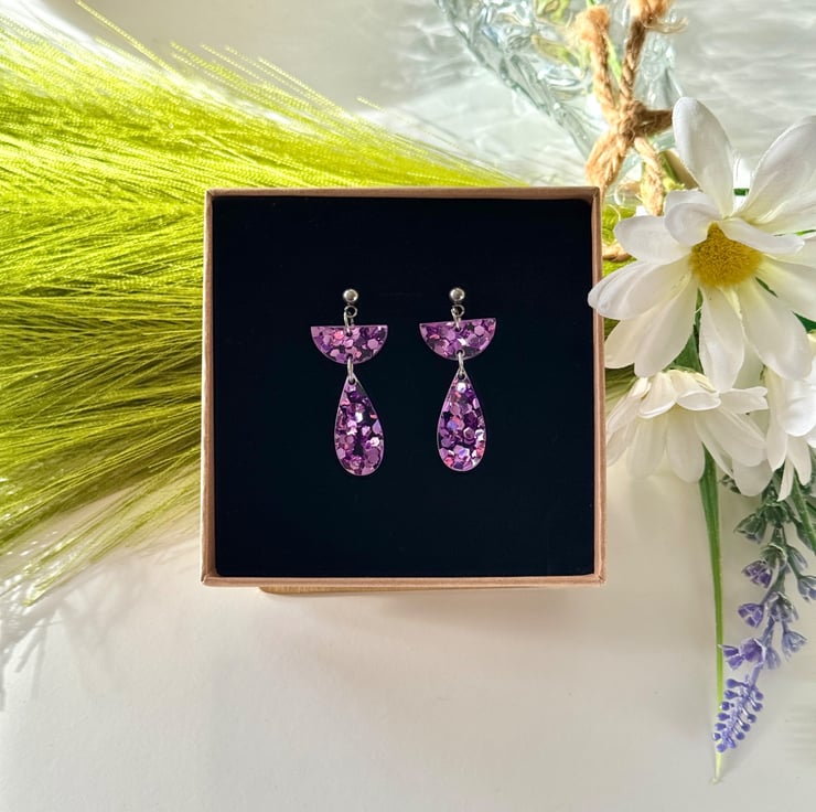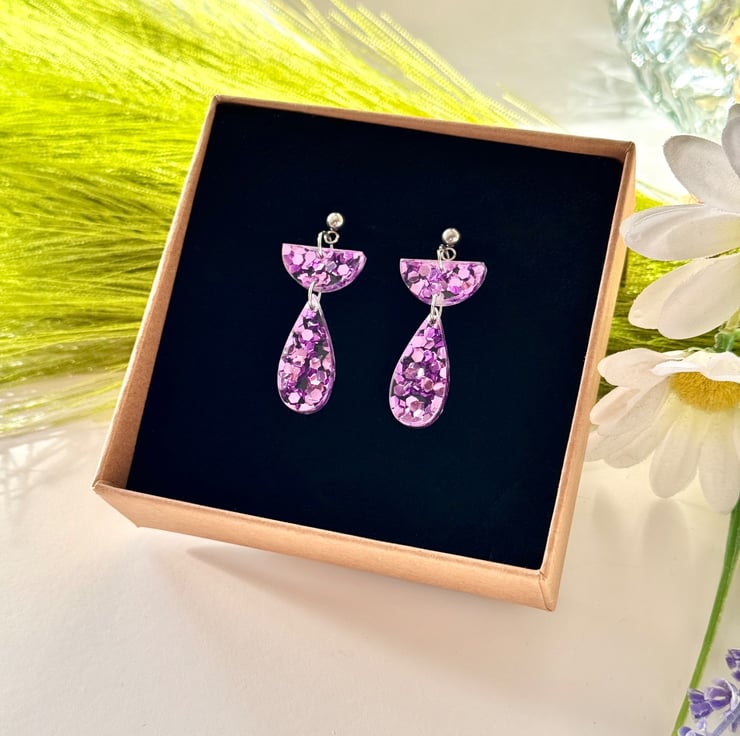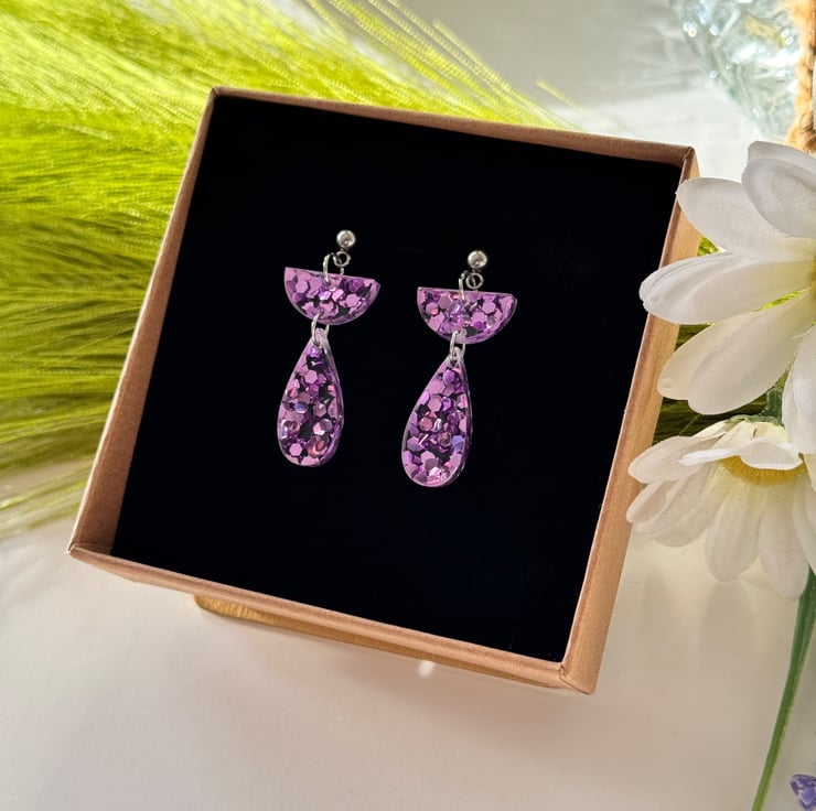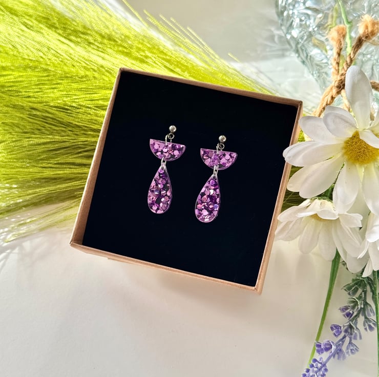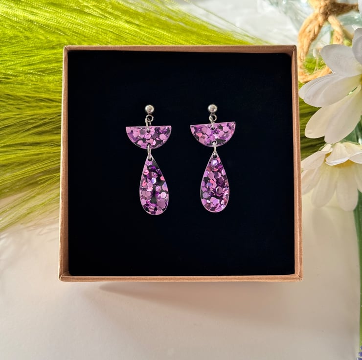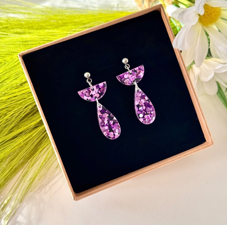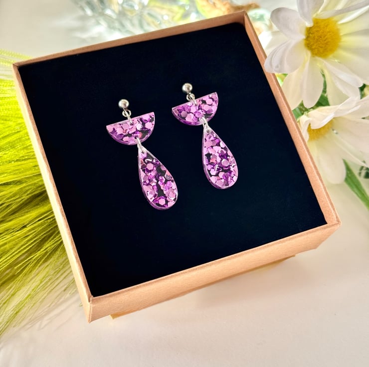 Confetti glitter in ice pink encased in clear acrylic with precision cut half semi circle tops and hanging teardrop finish.