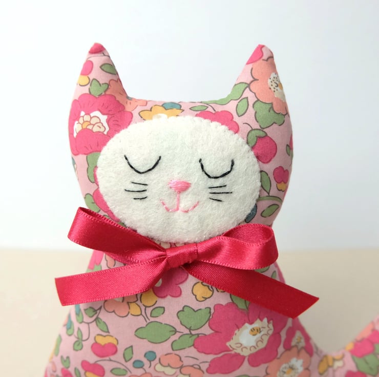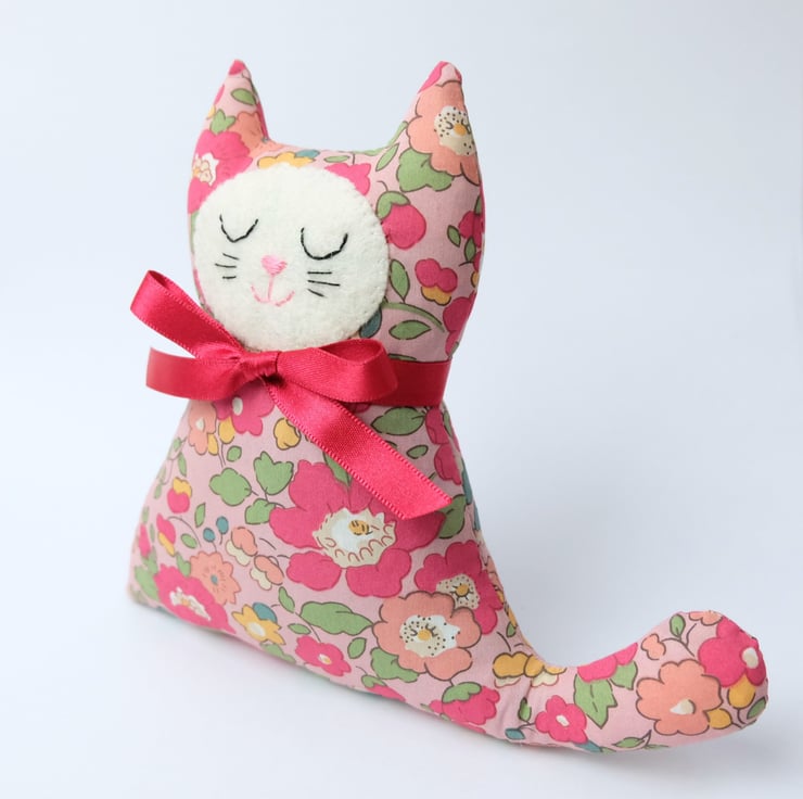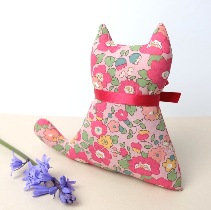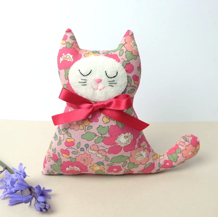 This cat shaped lavender sachet is handmade by me, using a Liberty Betsy tana lawn fabric in gorgeous shades of muted pink, along with green leaves and buds. The cat has an ivory coloured wool felt face, hand stitched with embroidery thread eyes, nose, mouth and whisker details. Perfect to place into bedroom drawers to sweetly scent clothes, or to sit on a pillow to help you have a restful night's sleep, the cat also makes a great festive gift for all the cat lovers!