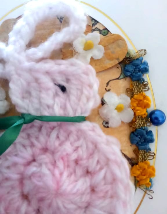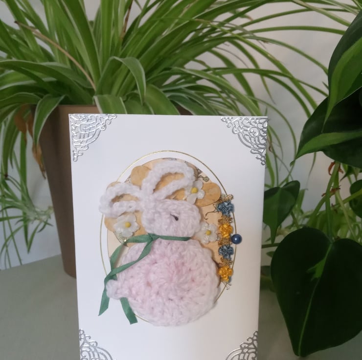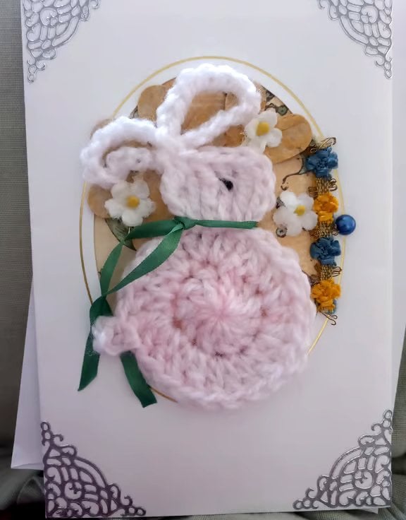 A lovingly crafted, unique and quirky, layered aperture card, with a crochet rabbit applique. I have crocheted a little white/pink rabbit and embroidered his little eye with embroidery thread. I have included a little green silk ribbon, aged paper flowers and other vintage decorative elements (ribbon and flowers) to make an attractive and sweet card suitable for many occasions. Ideal for a Birthday, get well card, new baby, thinking of you card. The card is blank for your personal message. The card could be framed and kept as a treasured keepsake.