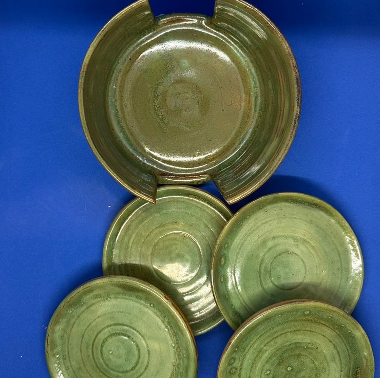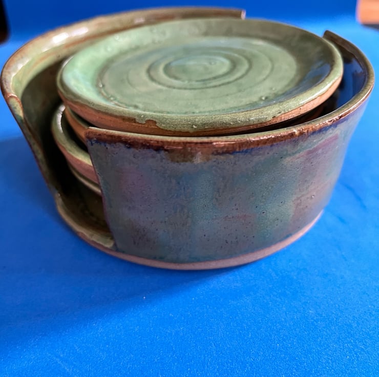 Coaster holder with 4 coasters . Each piece handmade individually on the wheel and glazed in soft , glossy green.