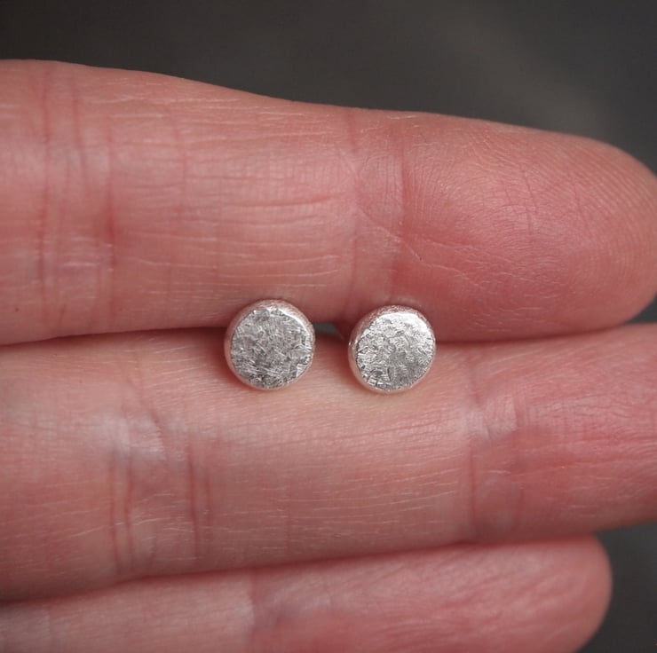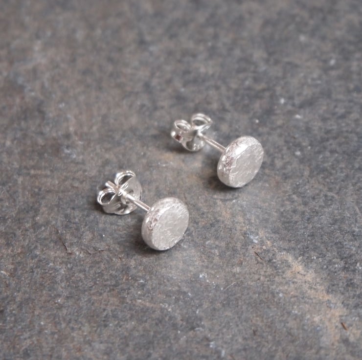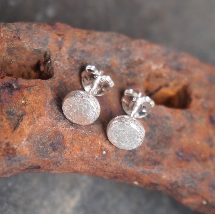 These stud earrings have been handmade from recycled sterling silver. The silver has been melted to form a pebble then hammered into shape. The earrings have been lightly textured & polished, adding a soft sheen to the surface.