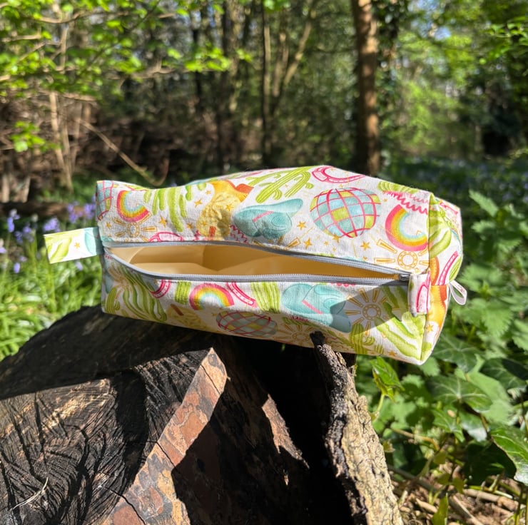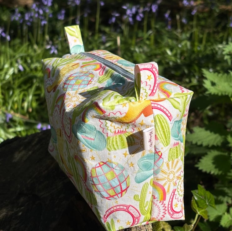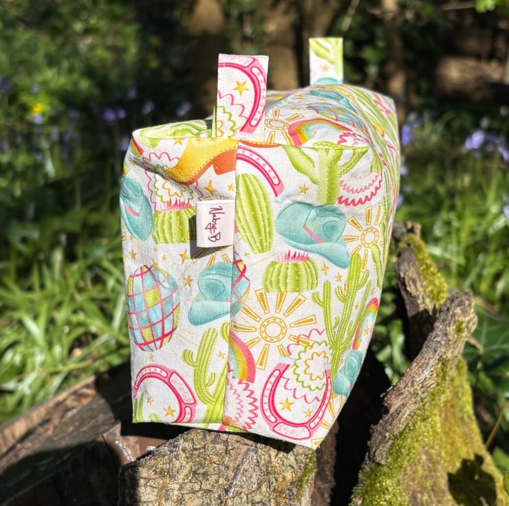 Hand crafted makeup or skincare bag in super fun fabric with cowboy boots, disco balls, rainbows and cacti!
