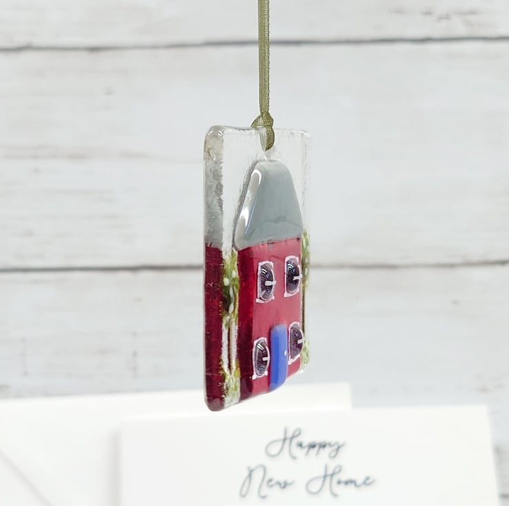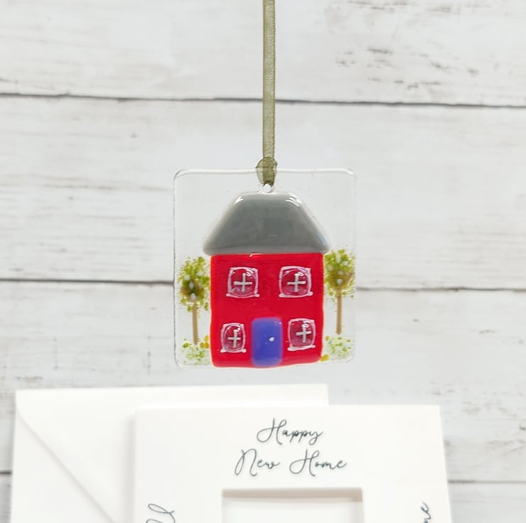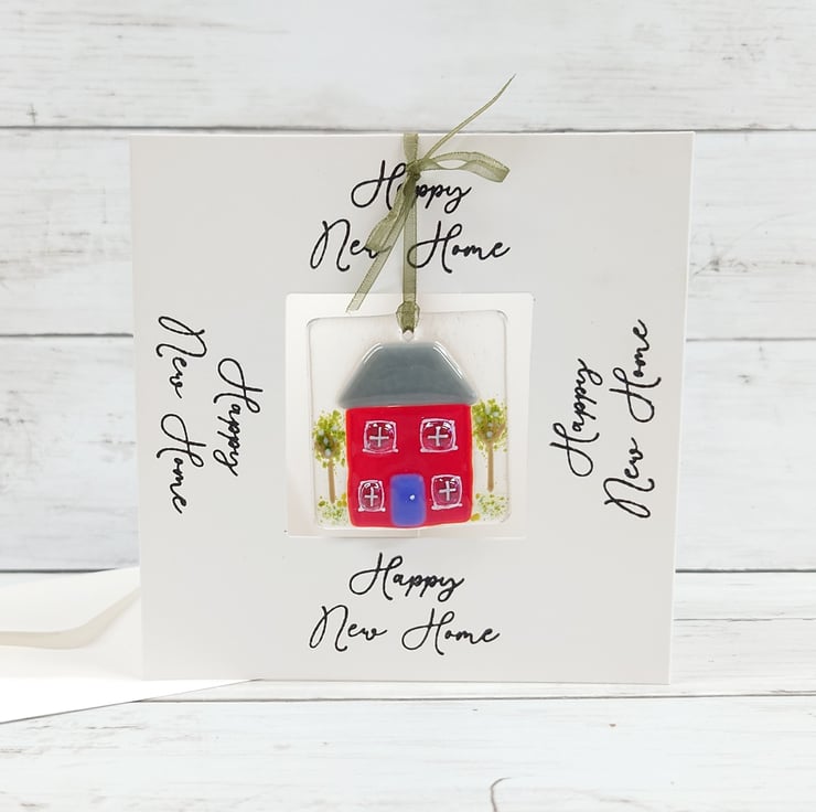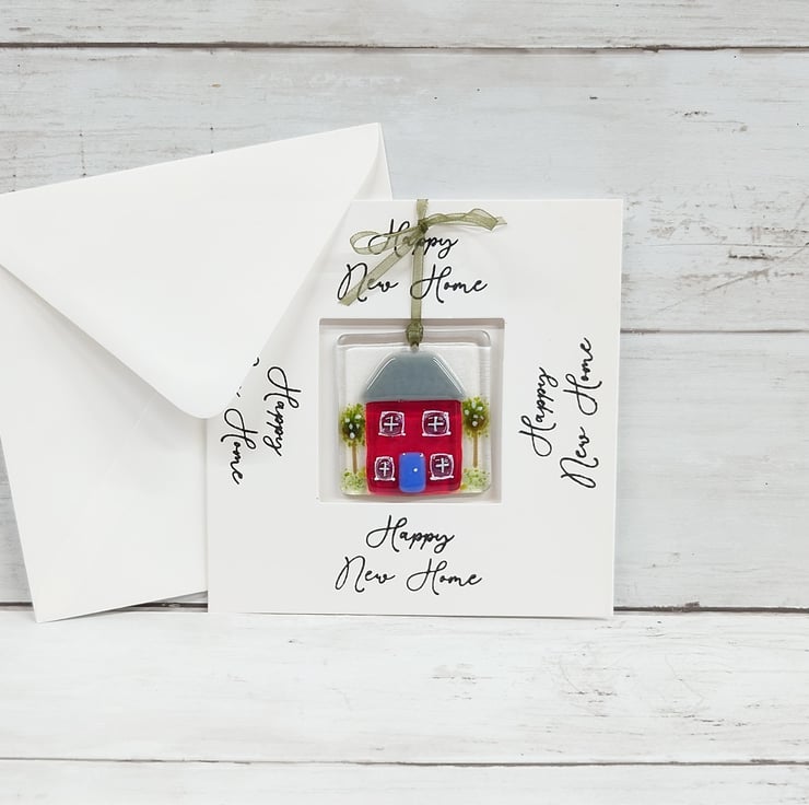 This delightful, Happy New Home card with a fun fused glass house keepsake is a lovely card and gift in one to give to someone moving home. The hanging house decoration is designed to be removed from the card and hung in the new home as a memento.