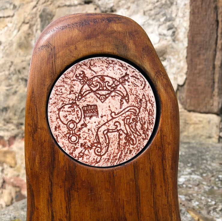 Inspired by my many visits to Pictish stones in the countryside and in museums, this Oak monolith is set with a ceramic plaque featuring authentic versions of Pictish carvings.