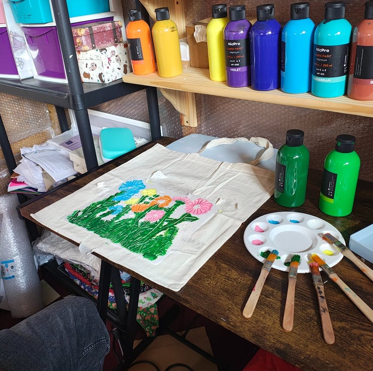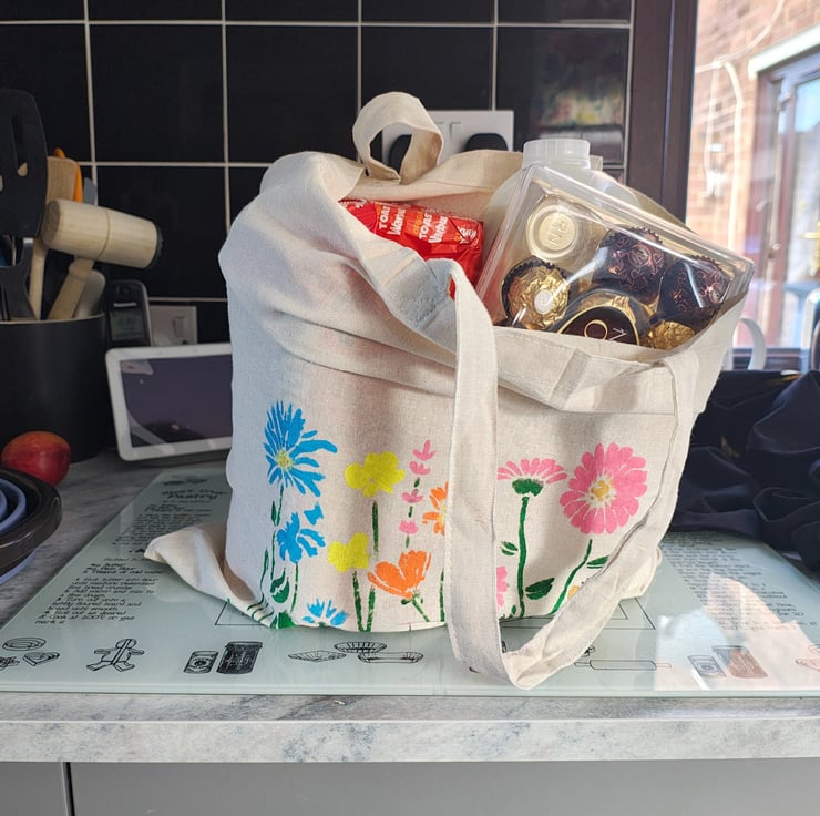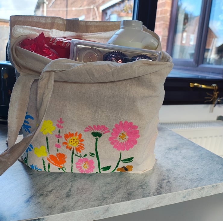 Cotton tote bag with a great design hand painted on the front. Great as a gift bag or a gift for someone special or even carry your laptop or shopping. Each bag is original so if you want to make any changes not a problem and no extra charge.