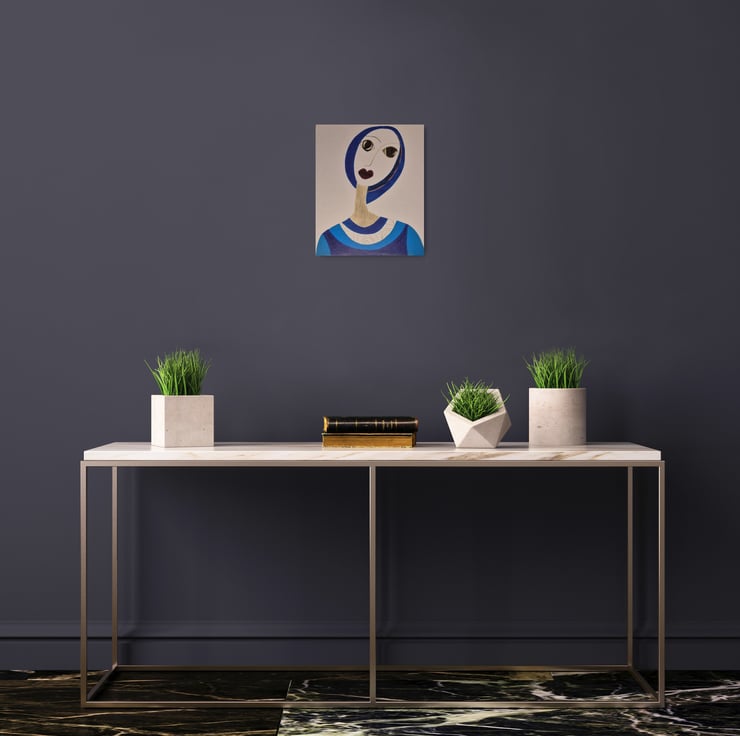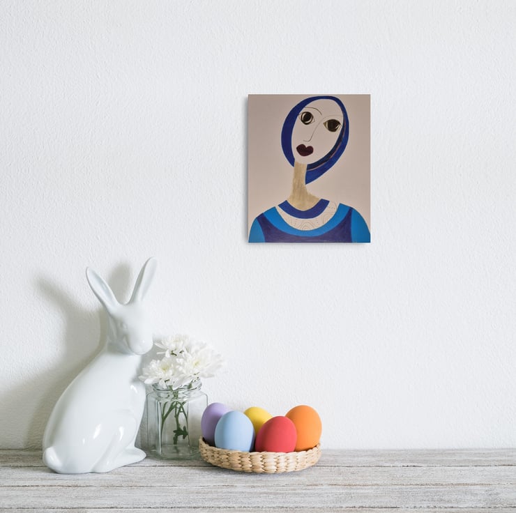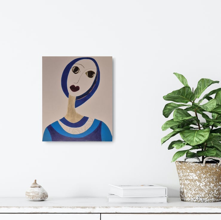 Pencil and pen art. Woman in blue with large eyes and inquisitive gaze