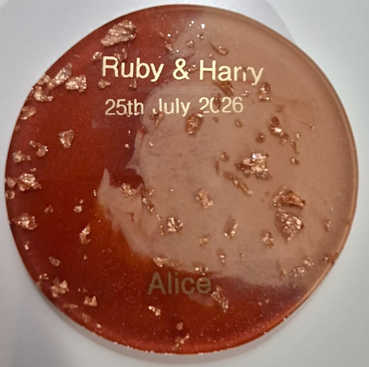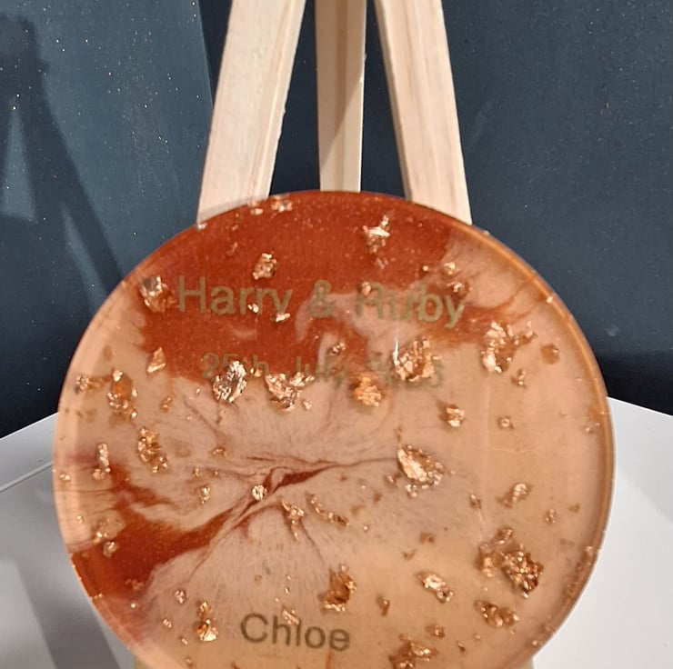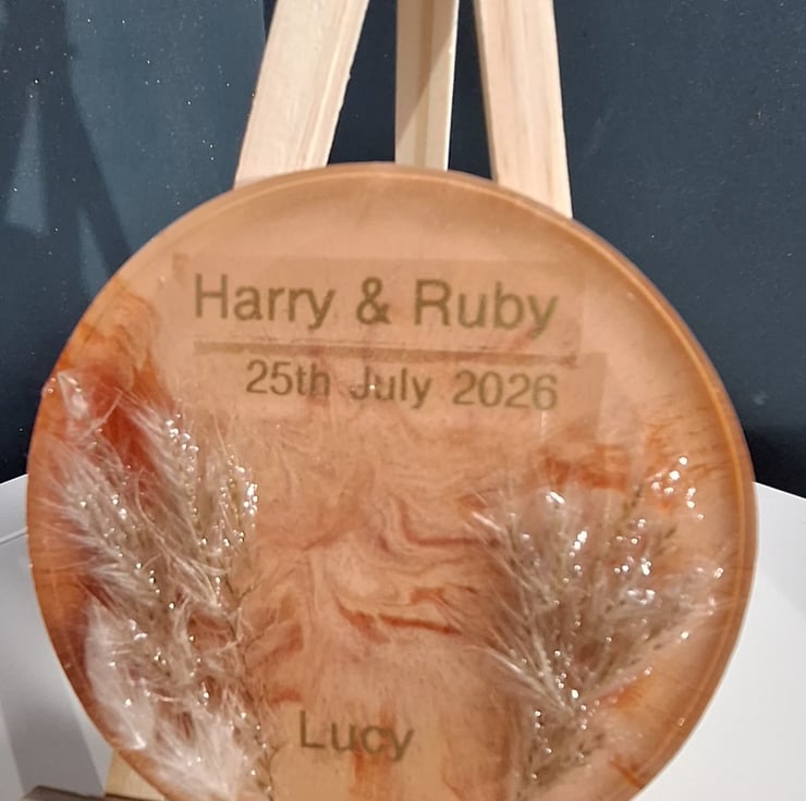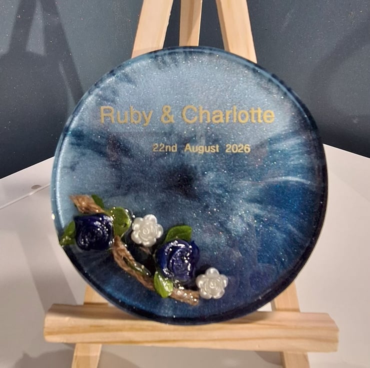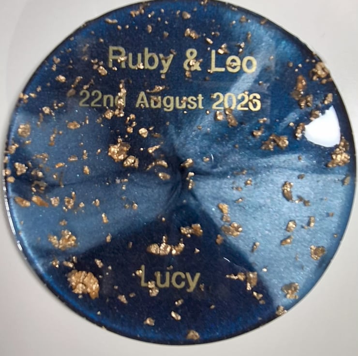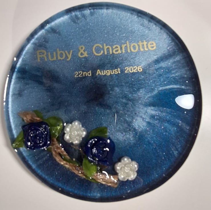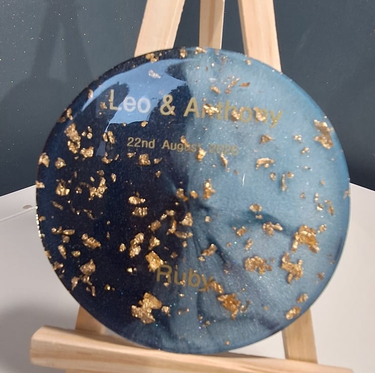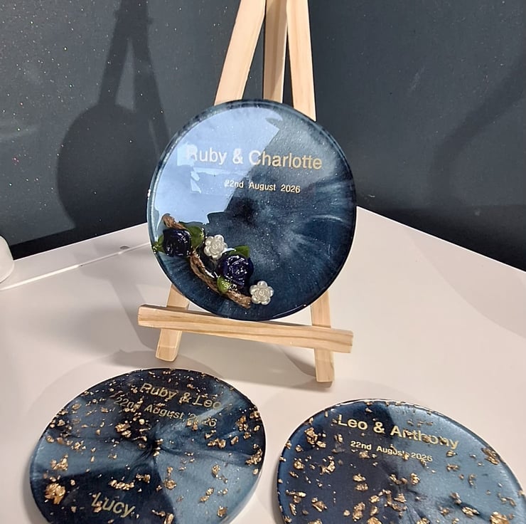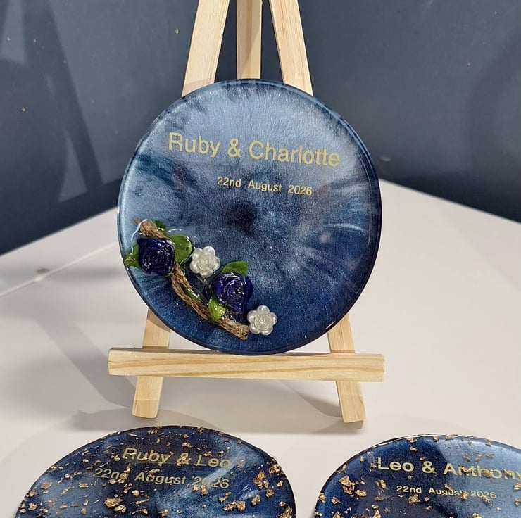 Each piece is personalised and features custom gold lettering with names and your wedding date. I work closely with you to match your wedding palette. Durable, high shine resin finish that feels luxurious to the touch.