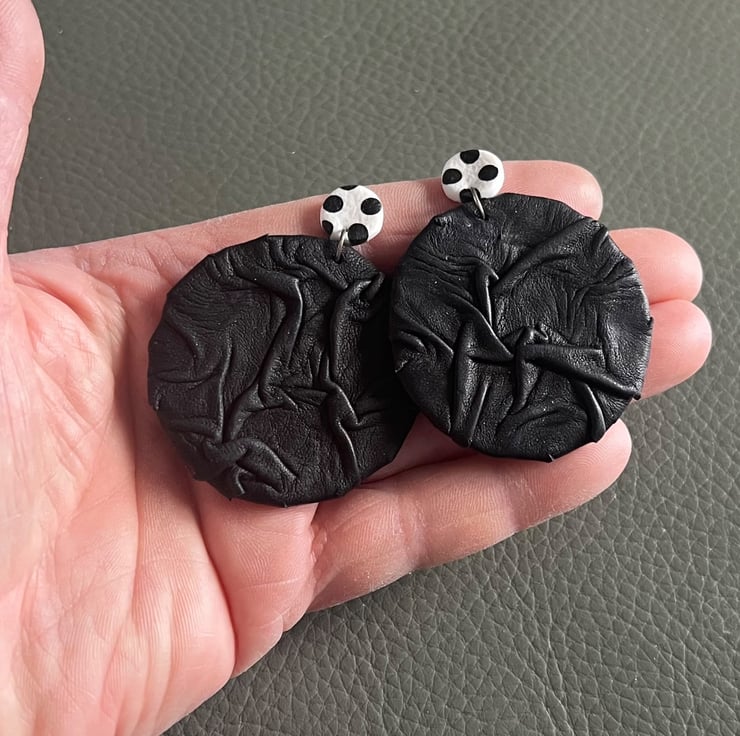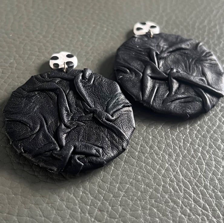 These unique circle earrings are handcrafted from natural leather and carefully shaped by hand to create a rich, textured surface. The black color combined with the sculpted, organic folds gives them an artistic and one-of-a-kind character. Lightweight and comfortable, they make a bold yet elegant statement-perfect for everyday wear or adding a creative touch to your outfit.