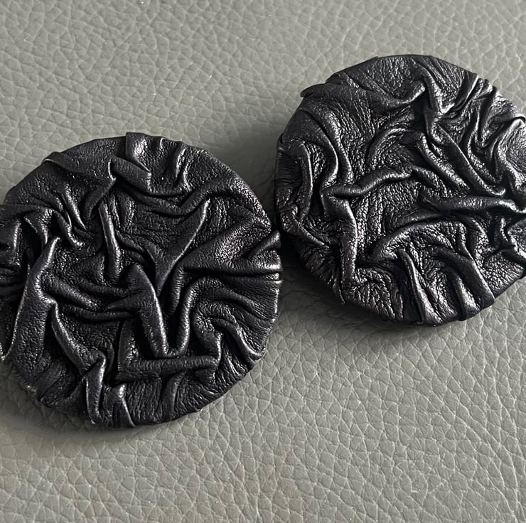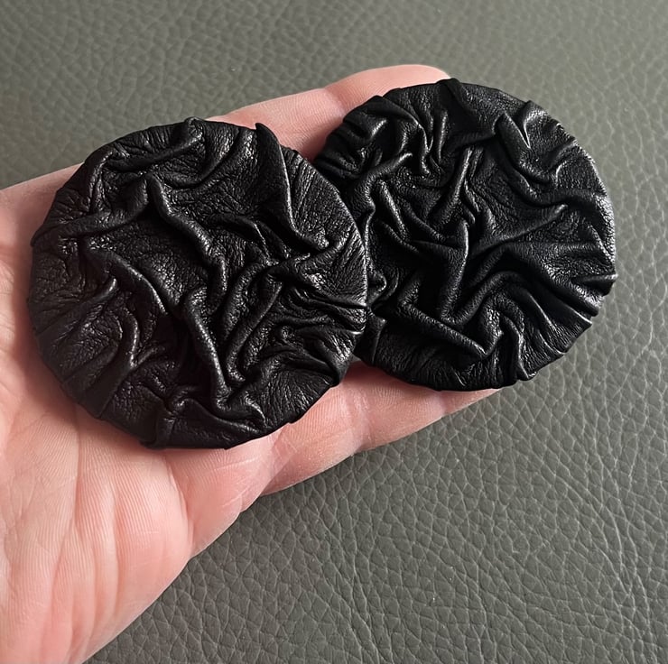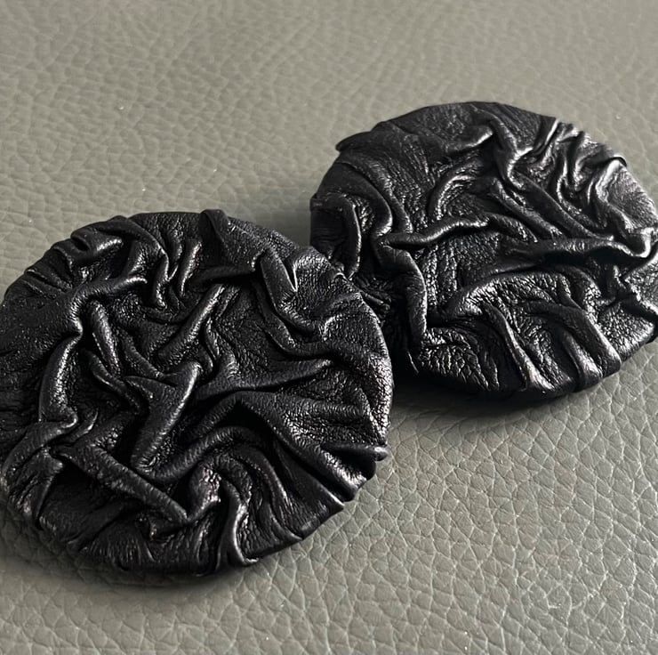 These unique circle clip on earrings are handcrafted from natural leather and carefully shaped by hand to create a rich, textured surface. The black color combined with the sculpted, organic folds gives them an artistic and one-of-a-kind character. Lightweight and comfortable, they make a bold yet elegant statement-perfect for everyday wear or adding a creative touch to your outfit.