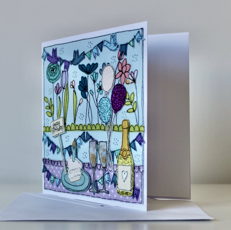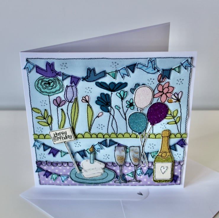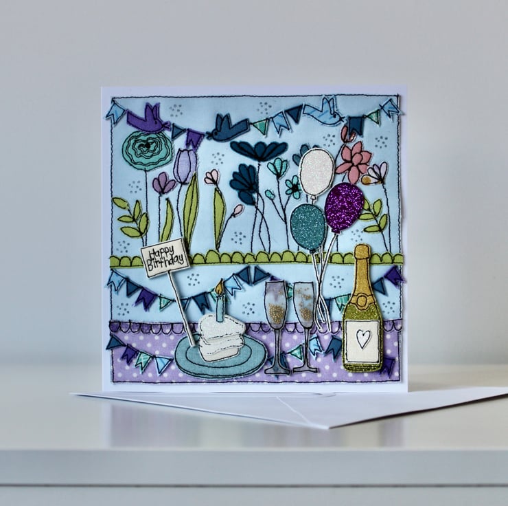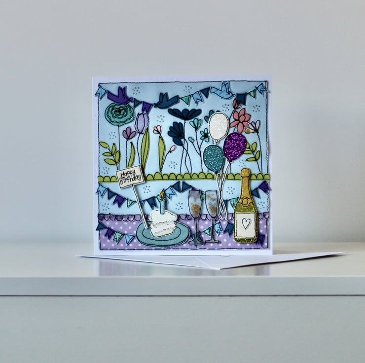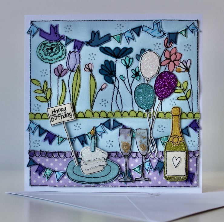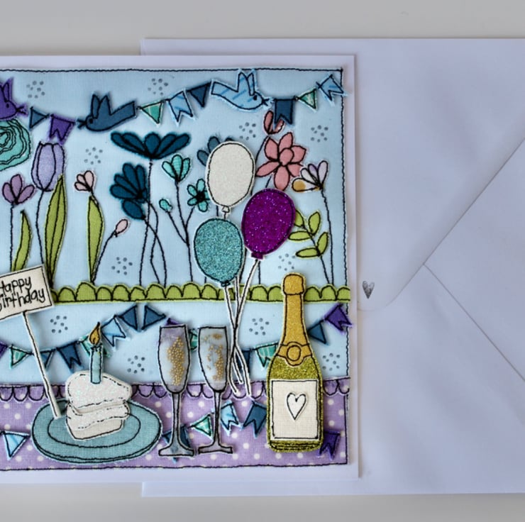 This handmade card has been sewn by me and my sewing machine, using cotton cloth, glitter cloth and metallic fabric; making it totally unique.