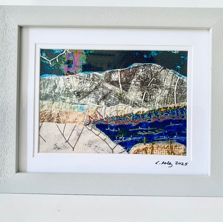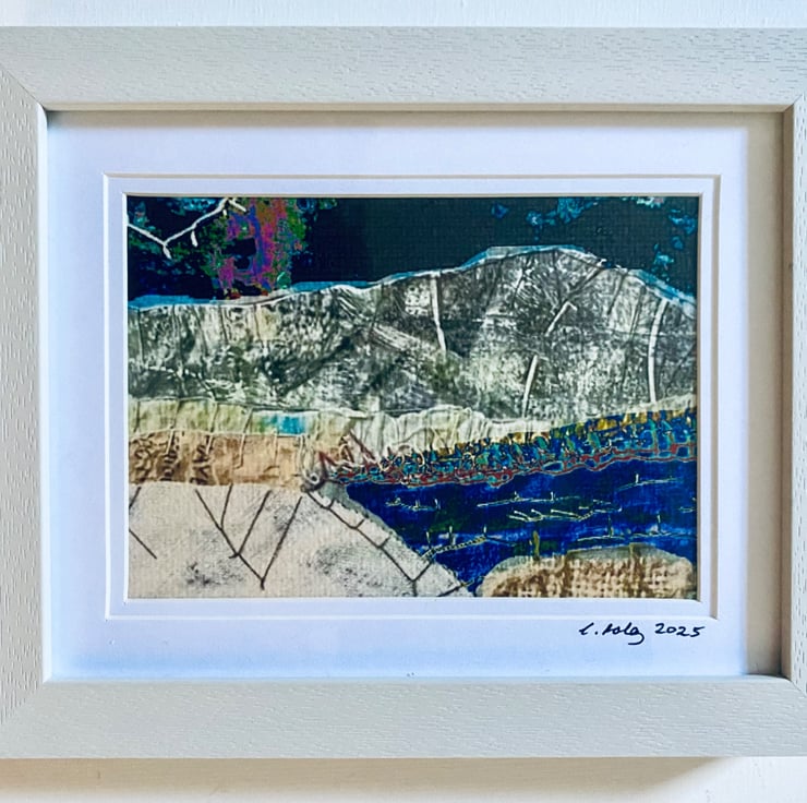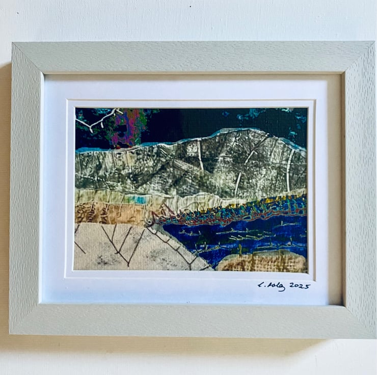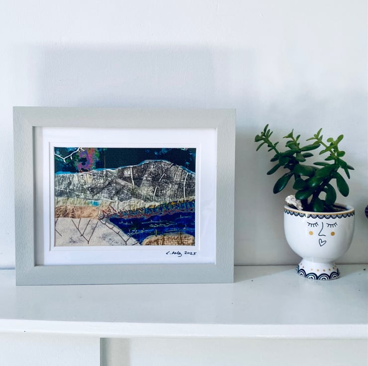 A framed, digitally altered print of my original textile art. It depicts a mountain and lakeside night view.