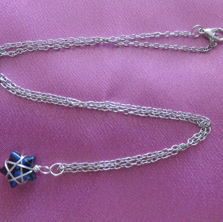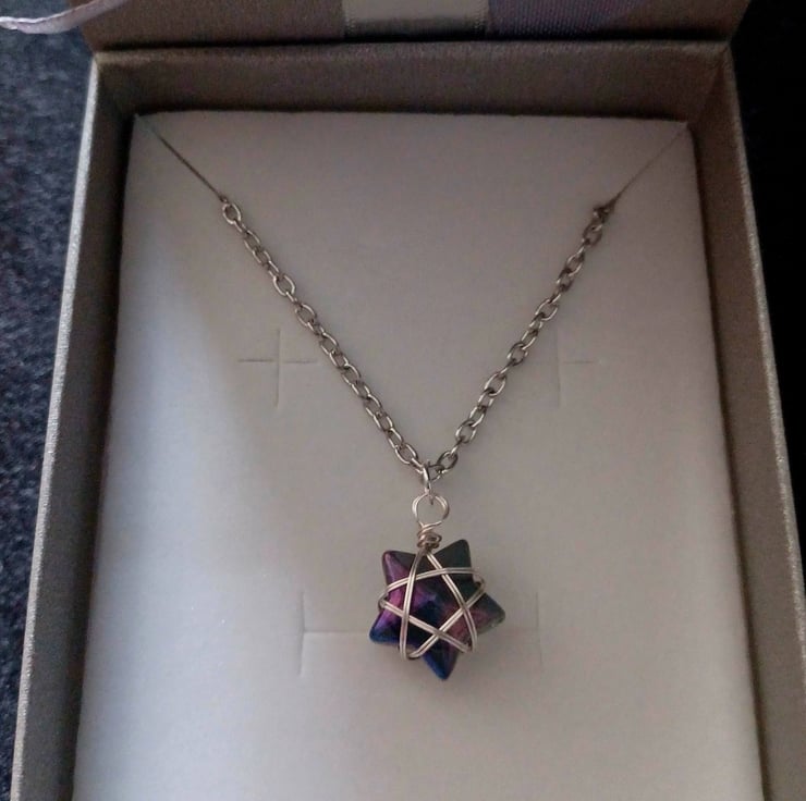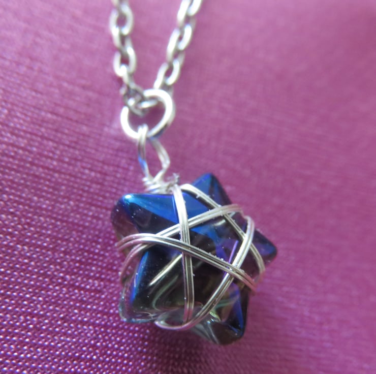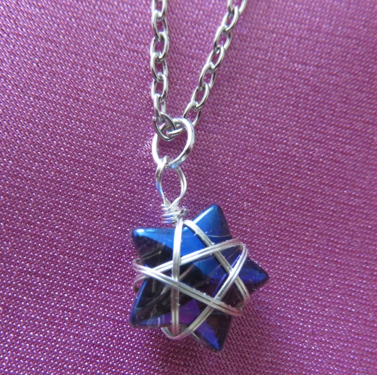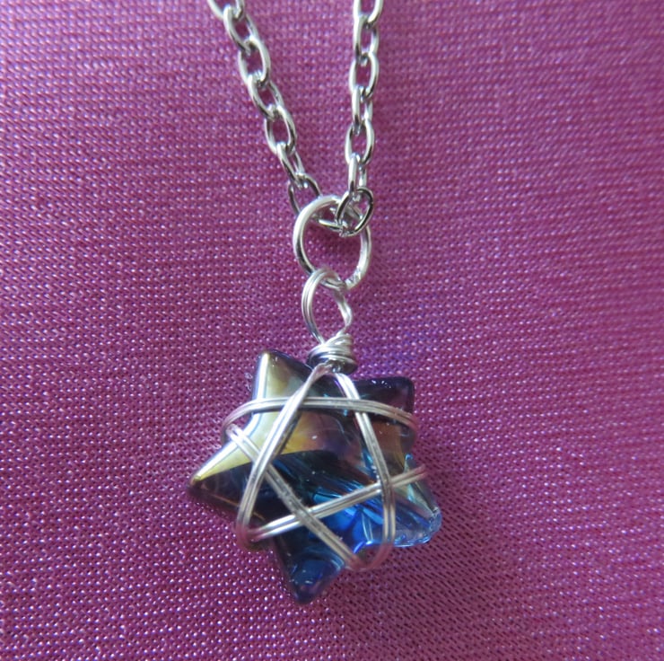 Glass wire wrapped stars on a silver tone 20" chain. The star is a shade of purples and blues which change shade in different light.