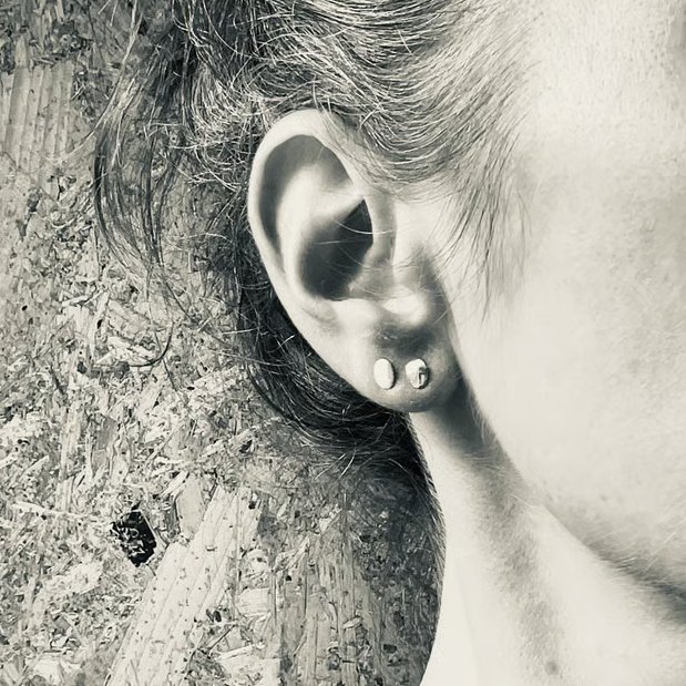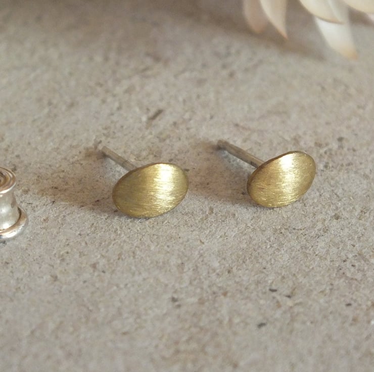 These studs are made of brass and gently domed to catch the light. Their minimal form and soft curves make them a versatile everyday piece. Subtly luminous, the brass surface is hand-finished with a satiny brushed texture, giving each earring a tactile quality. The studs are soldered onto sterling silver posts and secured with sterling silver backs for comfortable daily wear.