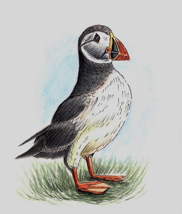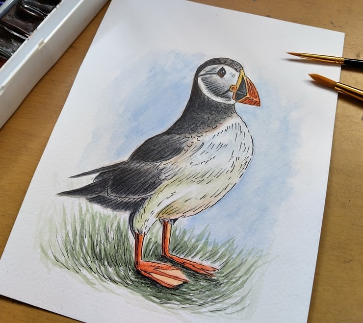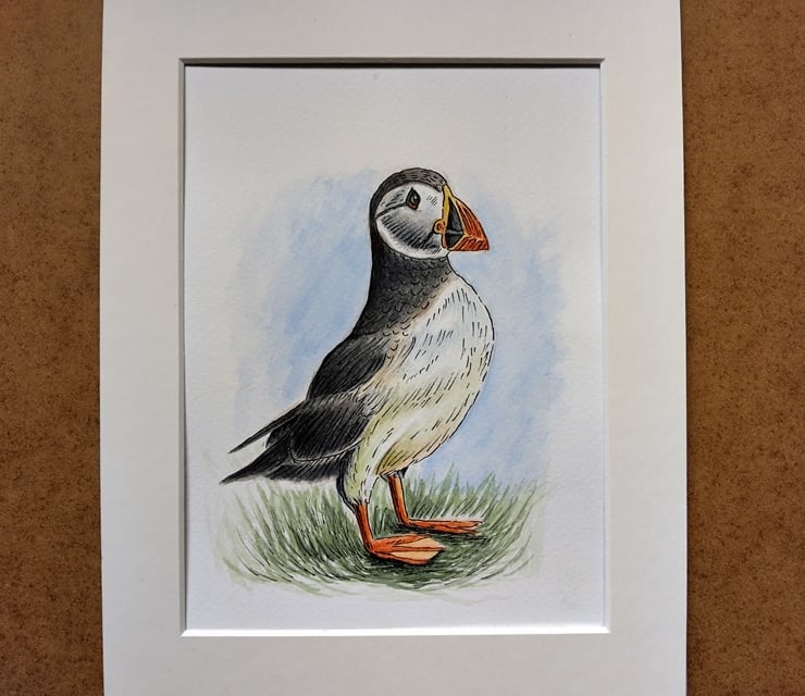 This is an original watercolour and ink painting of a puffin. These adorable birds are so popular. This painting would be a wonderful centrepiece for any rustic room.