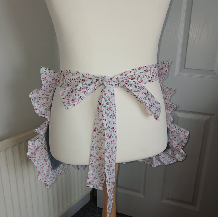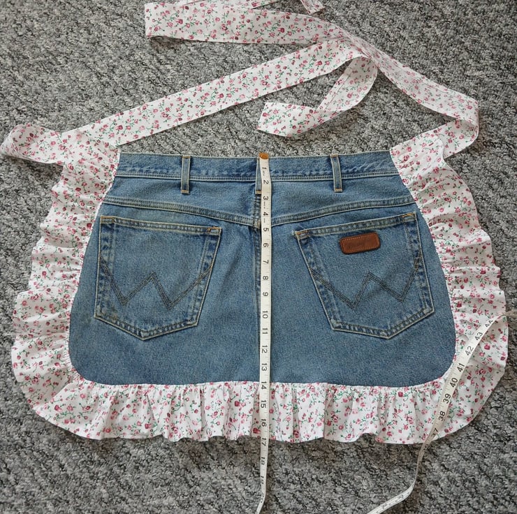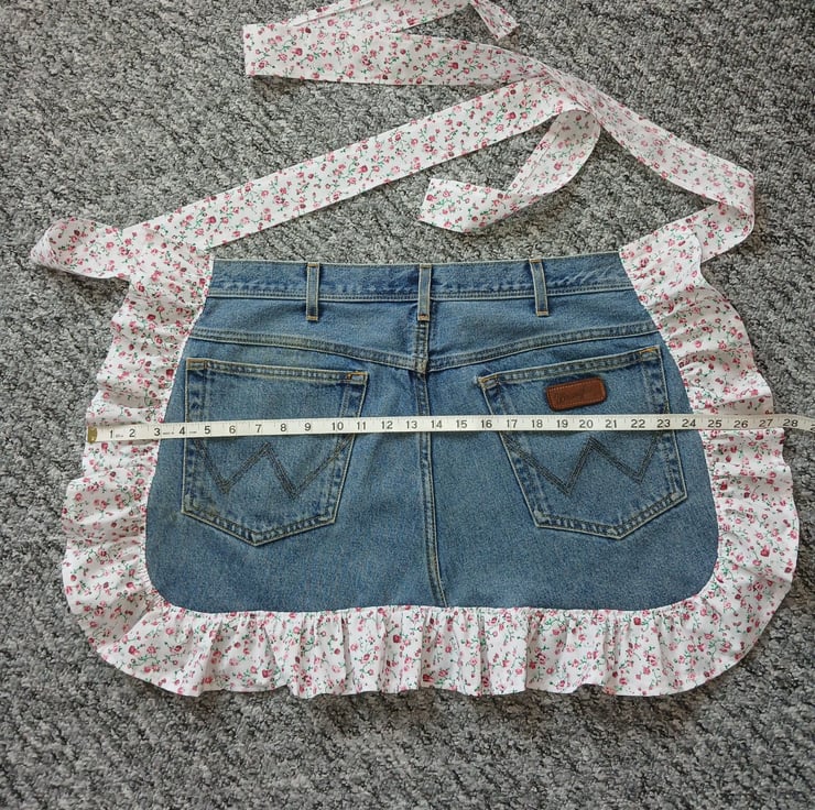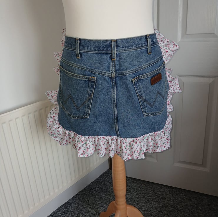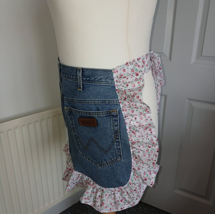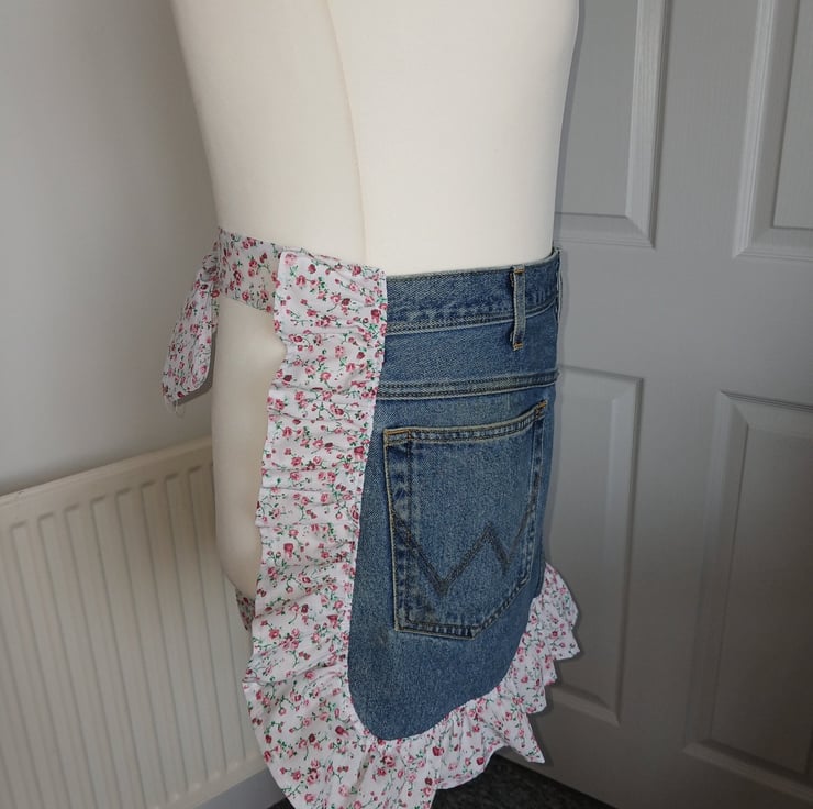 Upcycled from a pair of denim jeans and a vintage style polycotton fabric for the ruffles and ties. ties are 1 metre long to allow for front tying if preferred. Eco friendly way to re-use items and re make them into something new. original pockets are intact