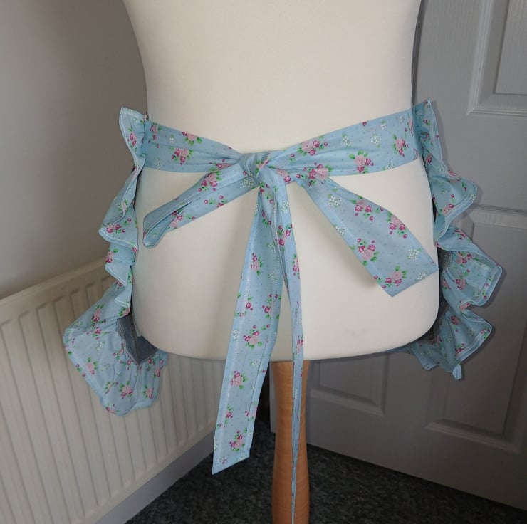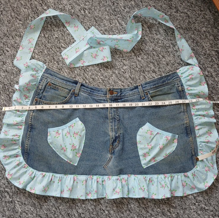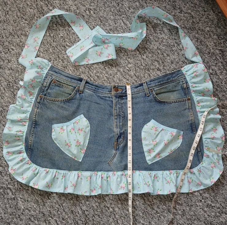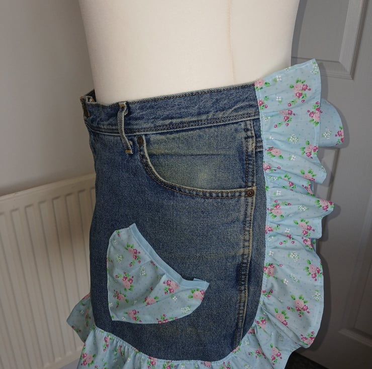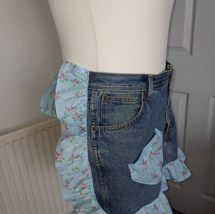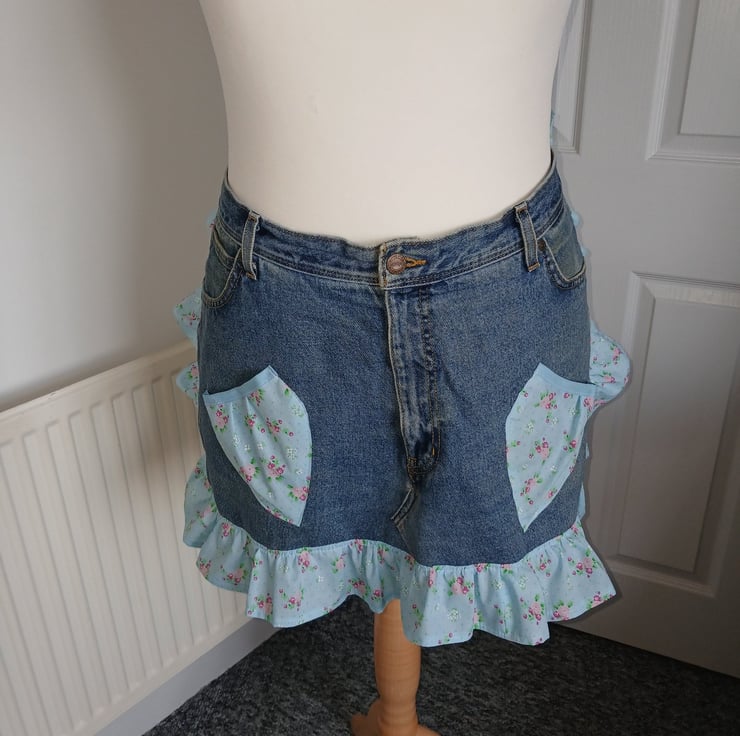 Upcycled from a pair of denim jeans and a vintage style polycotton fabric for the ruffles and ties. ties are 1 metres long to allow for front tying if preferred. Eco friendly way to re-use items and re make them into something new. original pockets are intact and 2 extra pockets added as shown