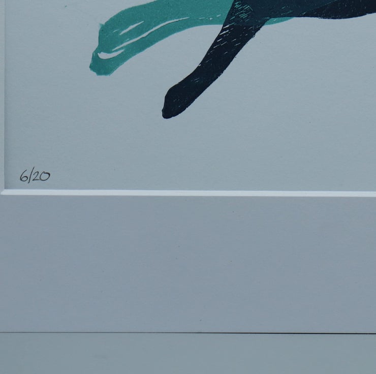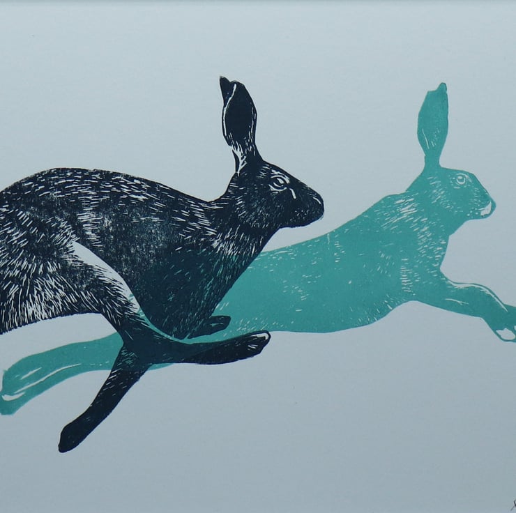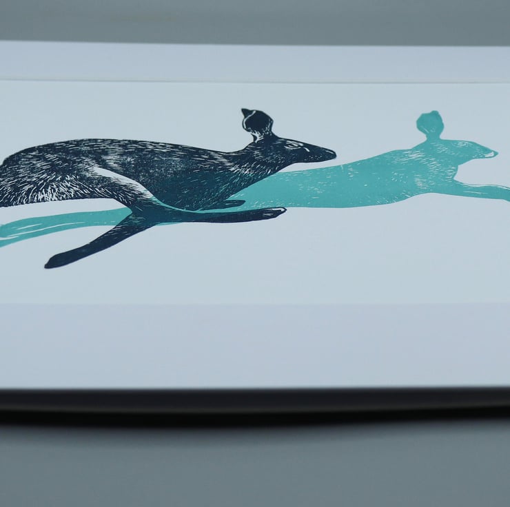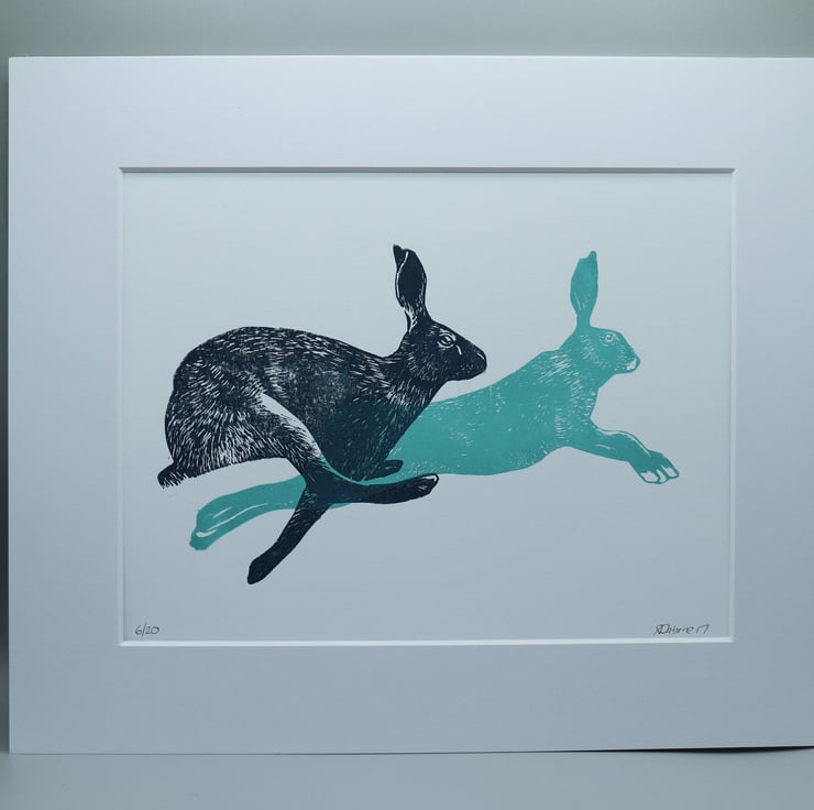 A lino print of two hare in mid run, printed on smooth high quality paper and mounted. I created it after working on a monoprint of the image which I was very proud of (please check it out in my shop).