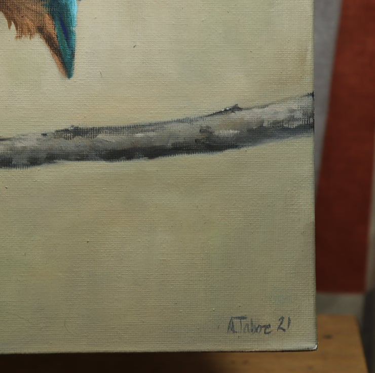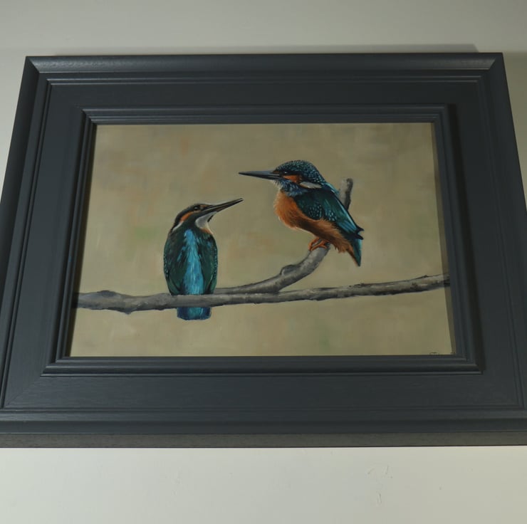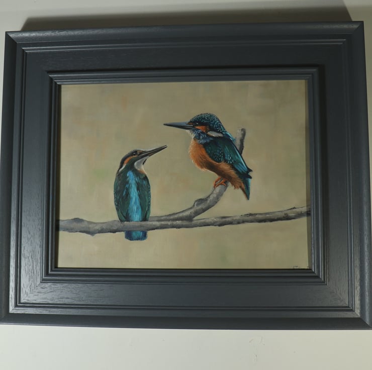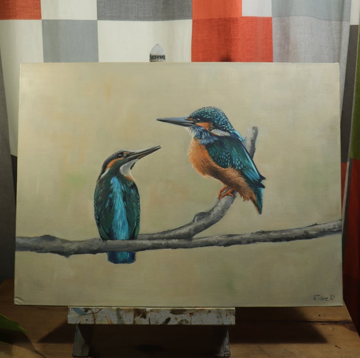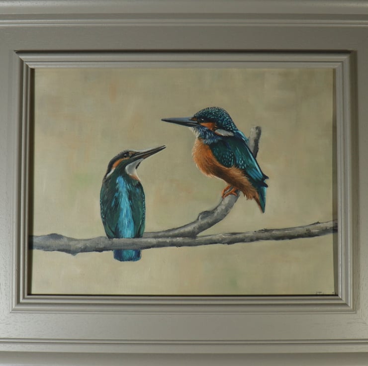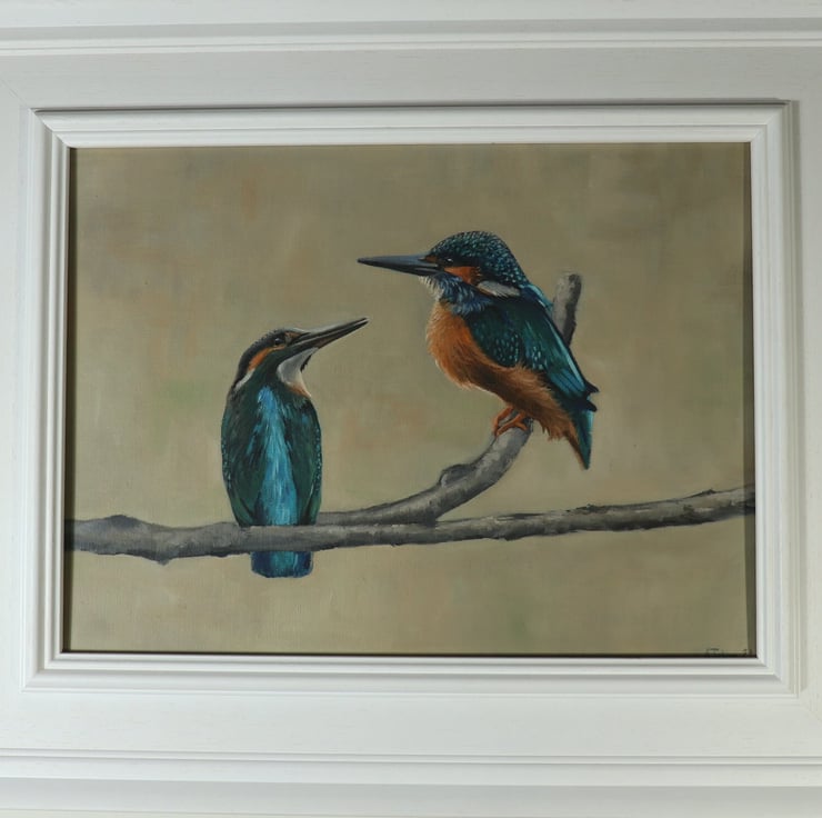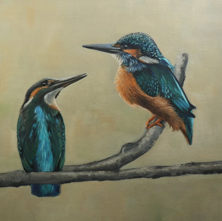 In this painting, a pair of kingfishers perch together, poised and watchful as they await their prey. You may imagine the conversation between them as they sit side by side.