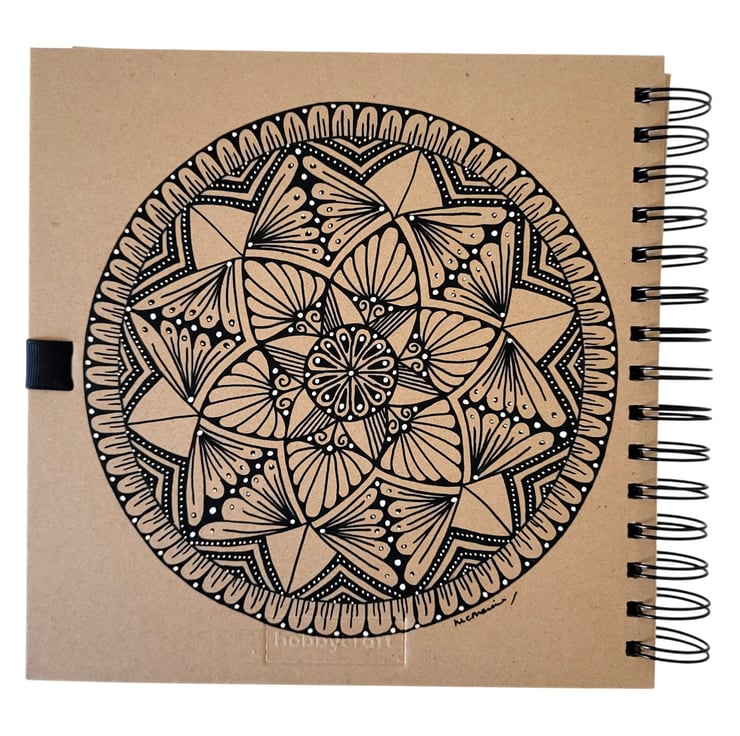 This unique spiral-bound scrapbook features hand-drawn mandalas on both the front and back covers, created with black and white Posca pens. The intricate designs add a personal, artistic touch to this craft book which can be used as a memory album or as a sketchbook.