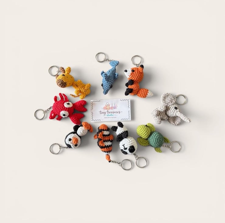 Handmade mini crochet animal keyrings and bag charms each one carefully crocheted by hand and perfect as gifts, keychains, or cute accessories.