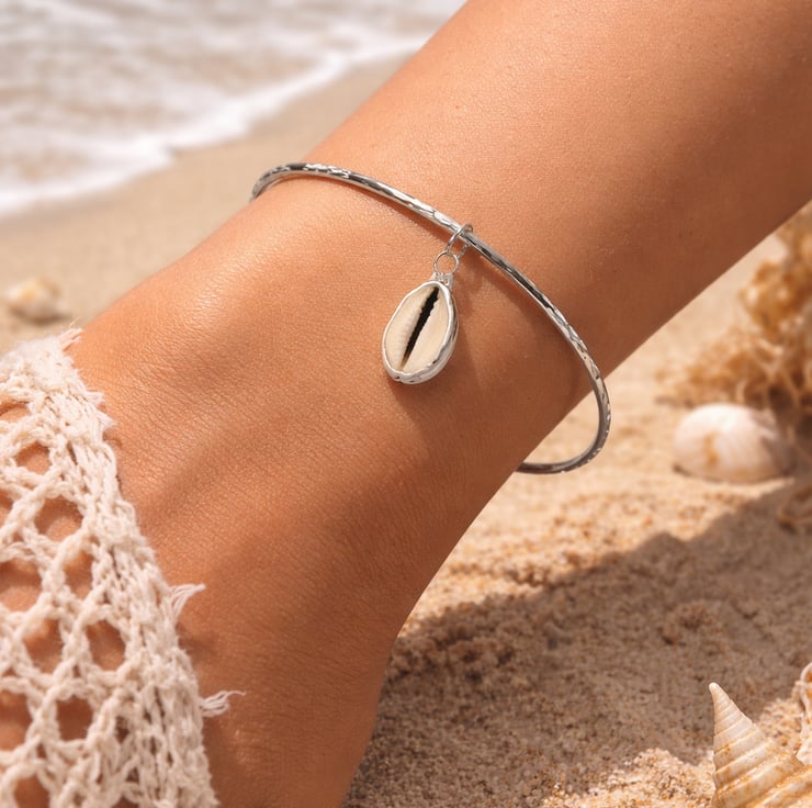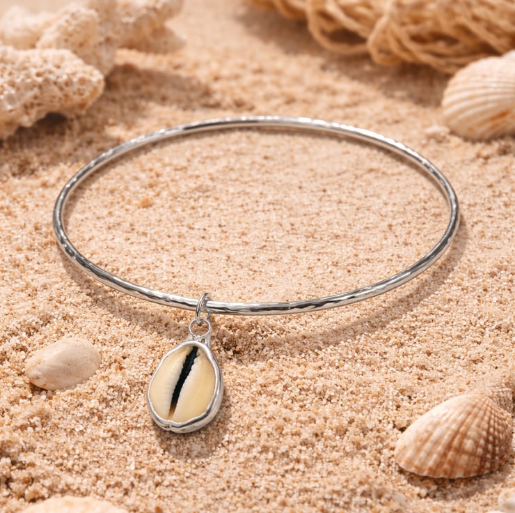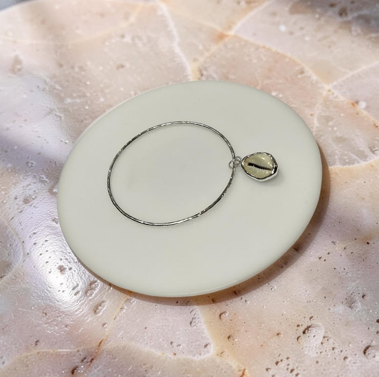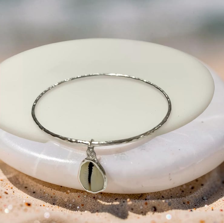 Handmade by SilverLines Jewellery in Woolacombe North Devon, this delicate cowrie shell beach jewellery is crafted from solid sterling silver, with the cowrie shell beautifully framed in fine silver.