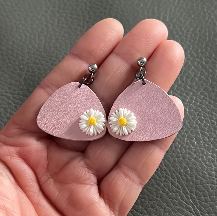 These lightweight earrings are carefully handcrafted from natural leather and hand-cut for a unique, organic finish. Their light pink color and white daisies adds a modern, eye-catching touch, while the minimalist shape makes them easy to style for both everyday wear and special occasions. Comfortable and stylish, they are perfect for anyone who loves simple yet distinctive accessories.