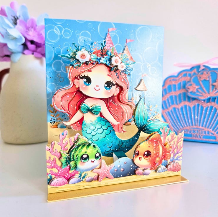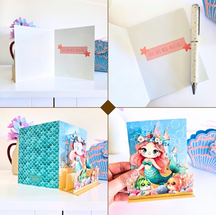 The image of the mermaid is attached to the card front, decoupaged with up to 3, layers of images, behind the also decoupaged fish and corals, creating a unique underwater scene with depth and dimension. When on display the layers pop up to reveal the 3d scene, and it folds flat to fit in an envelope. Finished inside with the sentiment "You Are Mer-Mazing!" and two starfish on either side, still providing you plenty of space for your handwritten wishes.