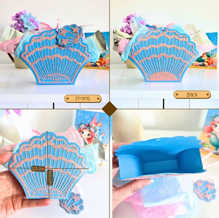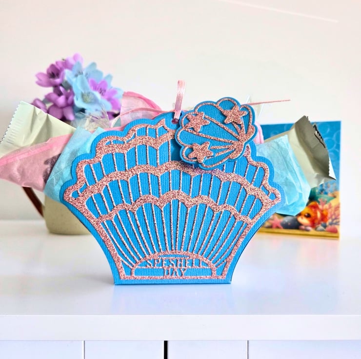 The shell shaped gift box is made with card in matching blue colour, layered with a decorative panel of glitter cardstock in frosty pink. Decorated front & back, with the message "Speshell Day" on the front. It is 12.5cm wide and 10.5cm tall, and it can hold small items and treats like chocolate balls, small chocolate eggs, small chocolate bars, sachets etc. It comes with a shell shaped gift tag and pink ribbon.