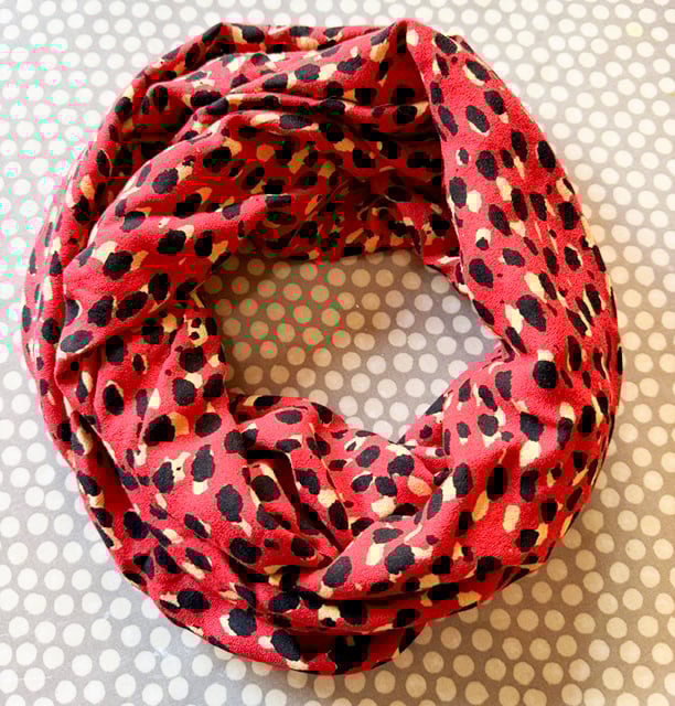 A stylish double twist infinity scarf in a lovely animal print. Made in a softly draping red, beige and black viscose fabric. The red is quite a subtle brick colour.