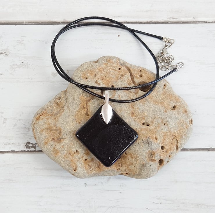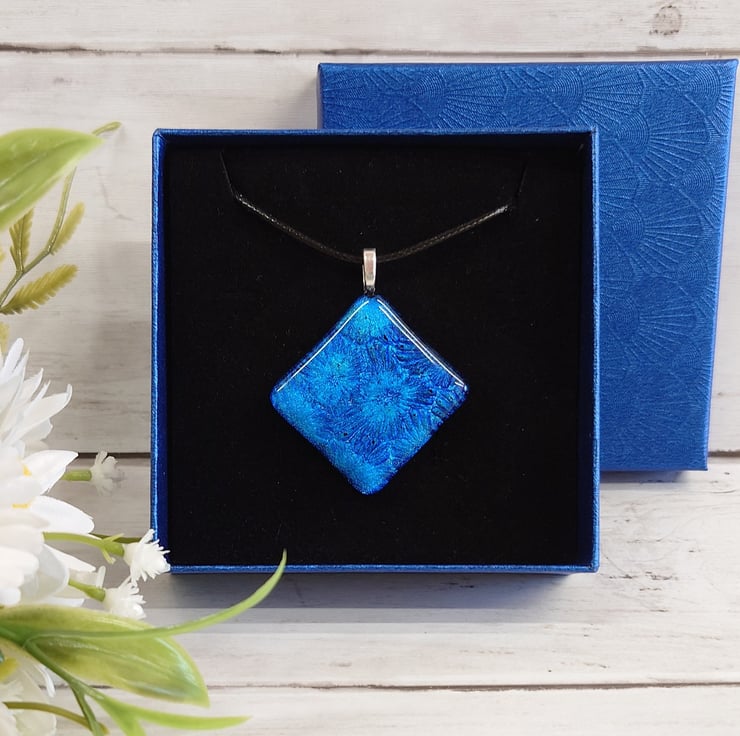 The diamond shaped glass pendant measures 4cm tall by 4cm wide and the necklace will come in a beautiful (uncannily) matching blue gift box.