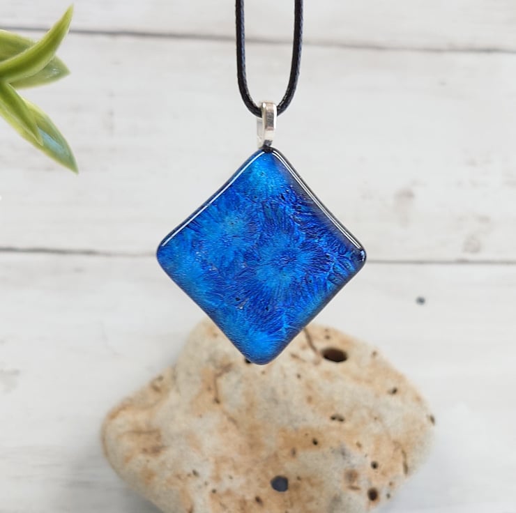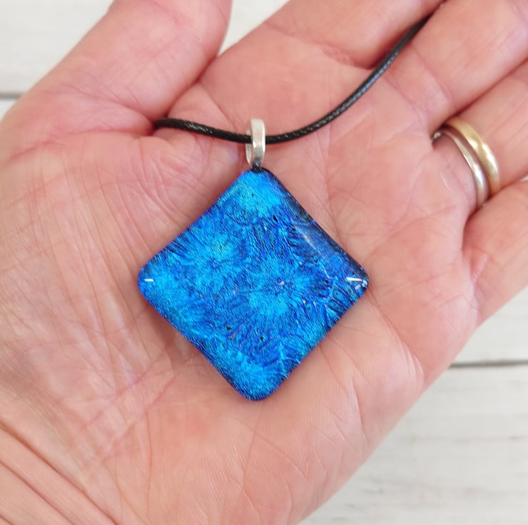 I've made this stunning pendant using dichroic textured, florentine teal blue glass capped with clear glass to give it a glossy smooth finish. The pattern is a wonderful starburst/fireworks effect in a captivating blue.