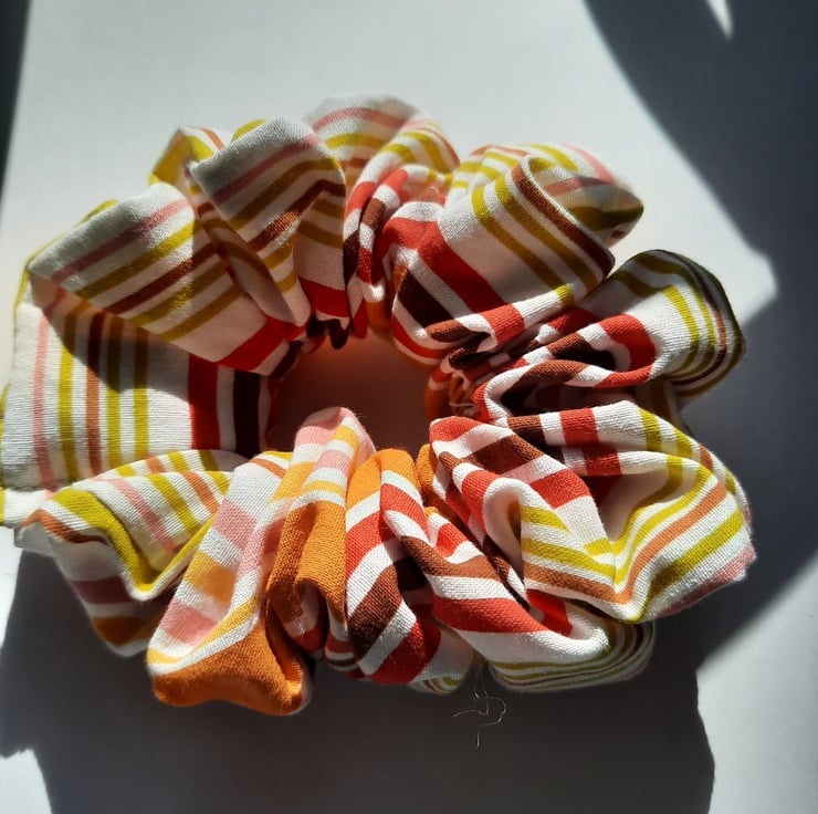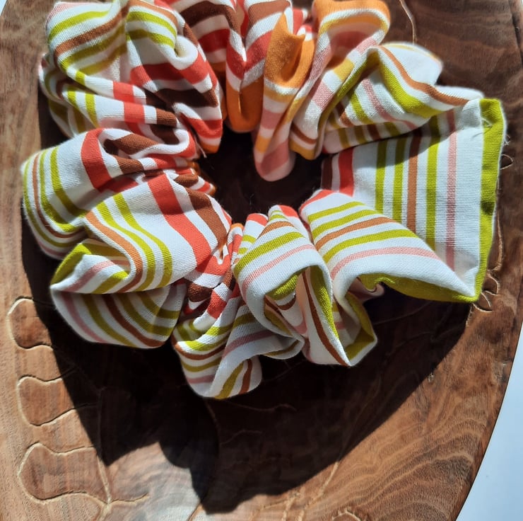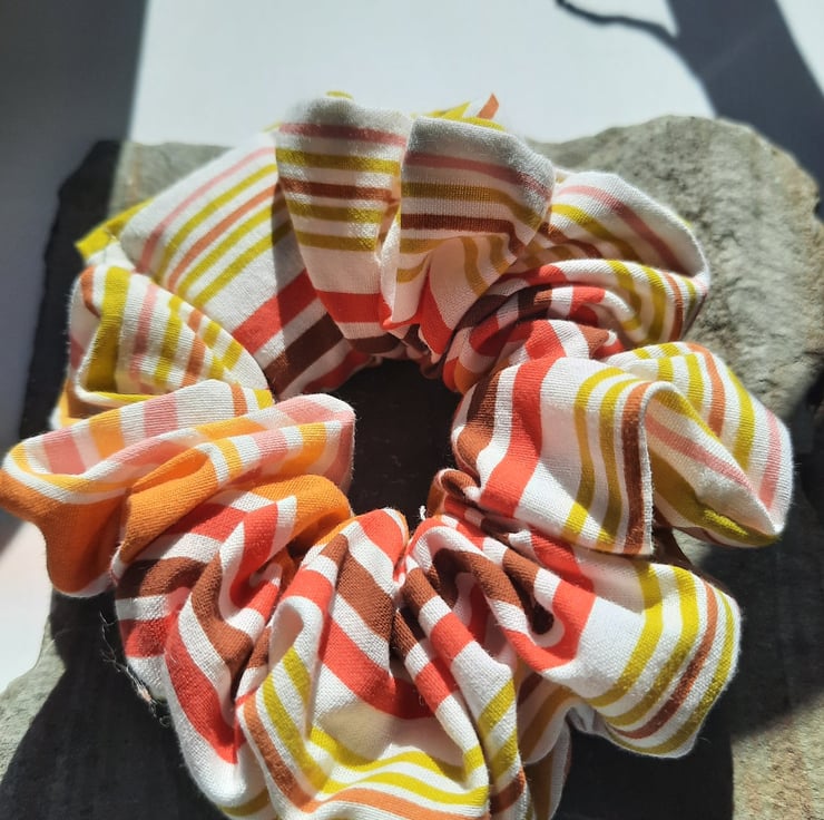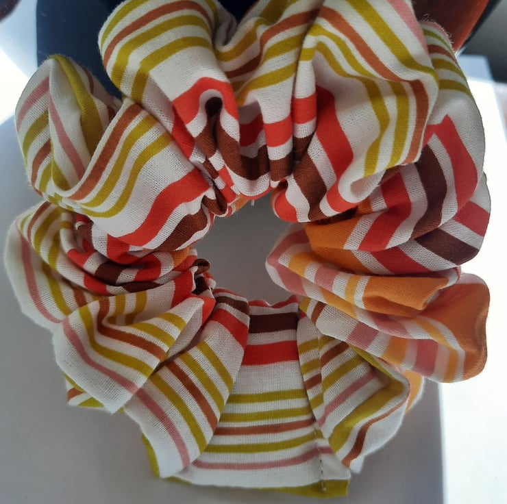 This is a soft Hair Scrunchie consisting of an elastic band encased in gathered, loose fabric. This particular Scrunchie feature a horizontal striped pattern in warm colours like orange,yellow,pink and brown. Scrunchies reduces hair breakage and tension compare to traditional elastic bands. Can also be worn as decorative wrist accessory.