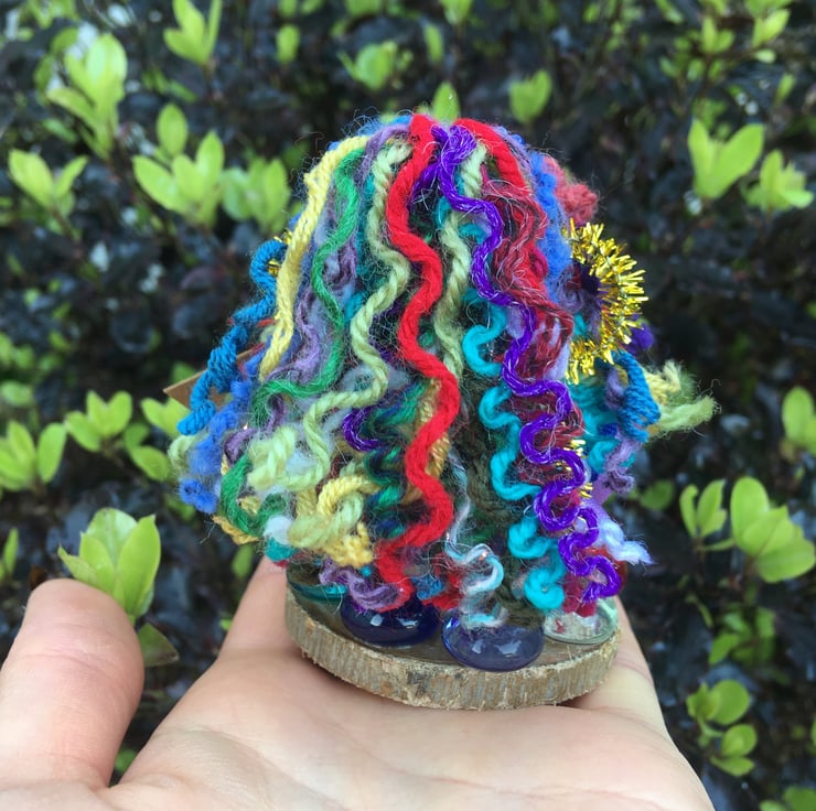 She has multicoloured curly wool hair.
