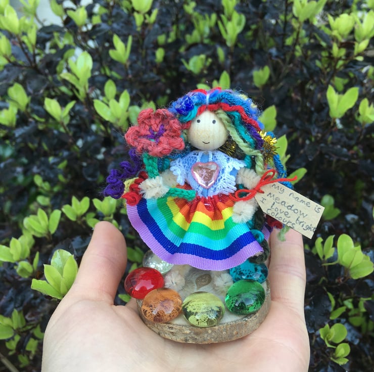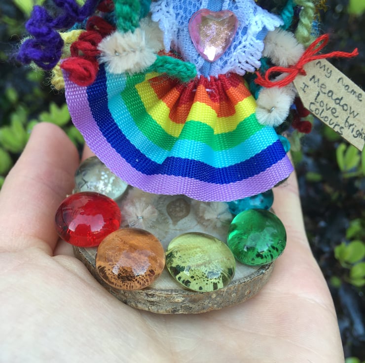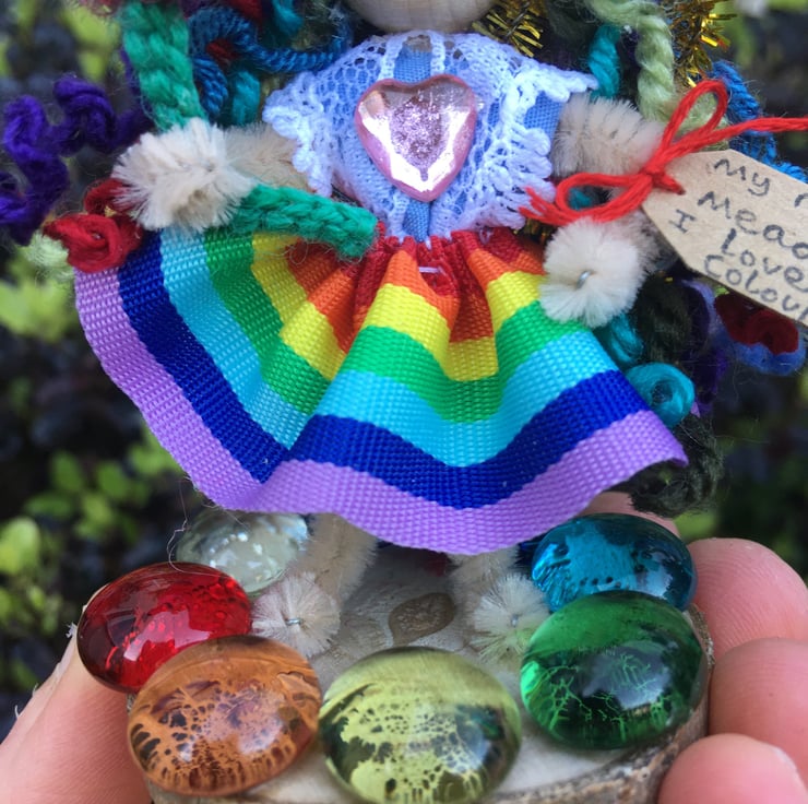 She is wearing a dress of rainbow ribbon, and she is standing on a small wooden slice embellished with rainbow gems.