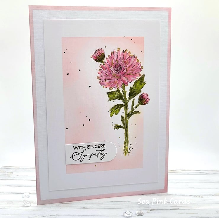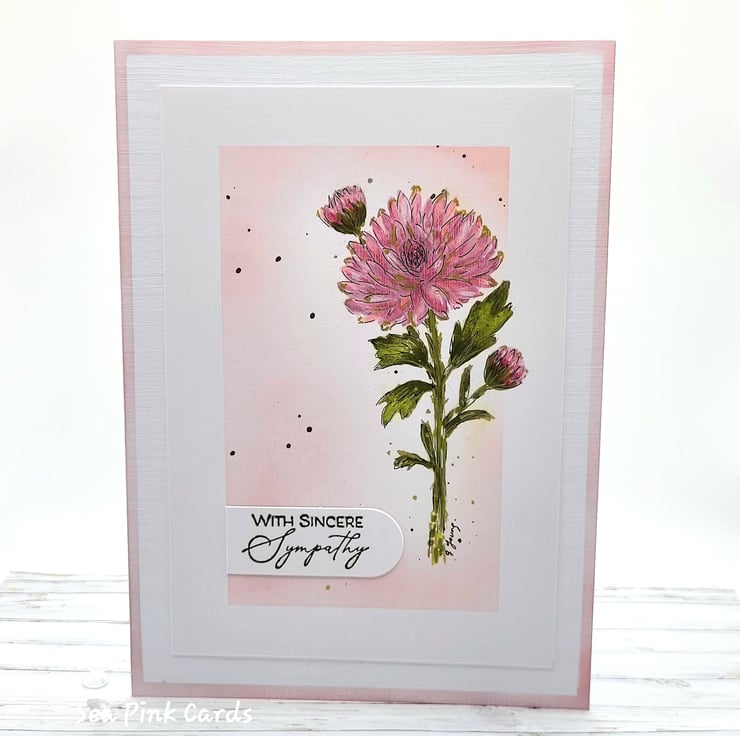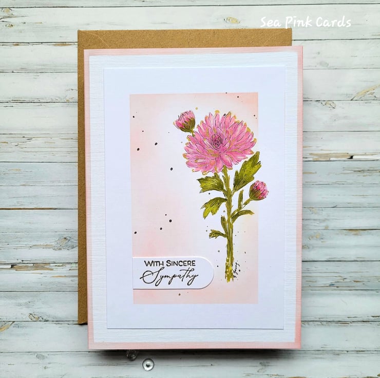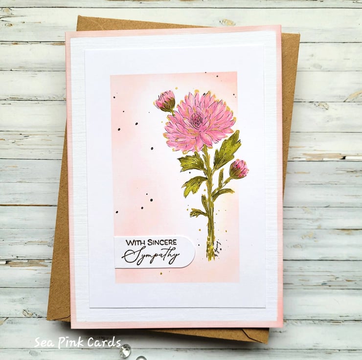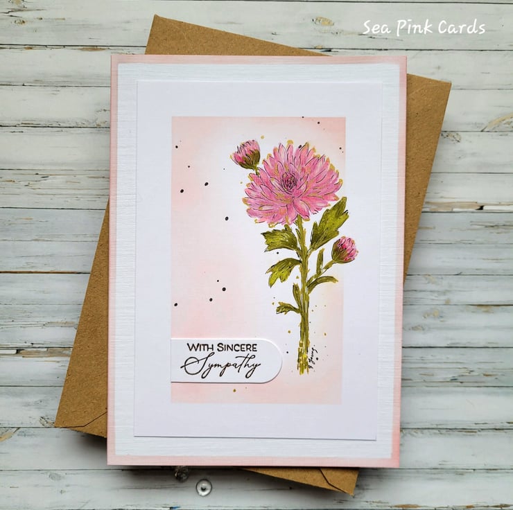 An original sympathy card with hand-drawn chrysanthemum flowers and a letterpress style sentiment in a clean and simple style. This unique handcrafted card is blank inside for writing your message and comes with a 100% recycled brown kraft paper envelope. Measuring 12.5 x 17.5 cms it has a layered design and subtle ink blended background. I drew the flowers then added colour with graphic art pens, gold pen and fineliner pens. The base of the card is hand-cut from recycled white linen cardstock, which is beautifully textured.